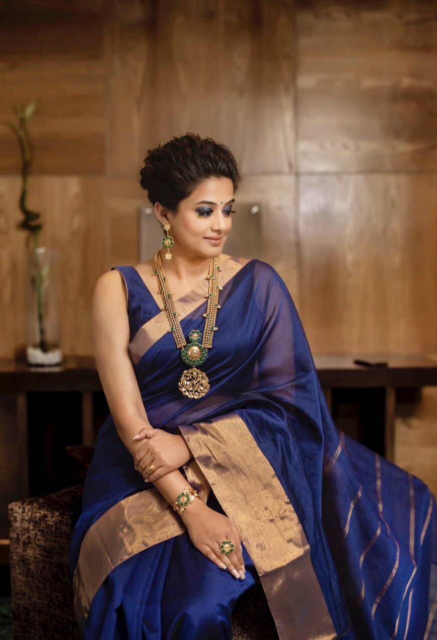 Priya Mani attended the Jio Filmfare awards South wearing a royal blue plain silk saree that featured gold border paired with matching sleeveless blouse. She finished off her look with traditional gold jewellery and a pulled back bun!