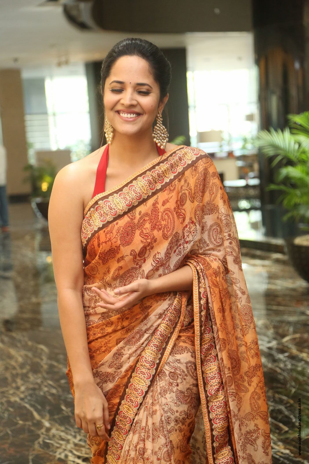 Anasuya Bharadwaj Stills at Rangasthalam Thank You Meet. Anasuya attended Rangasthalam Thank You Meet wearing a printed saree paired with red halter neck backless blouse. She finished off her look with a pair of big earrings and a tied-up bun!
