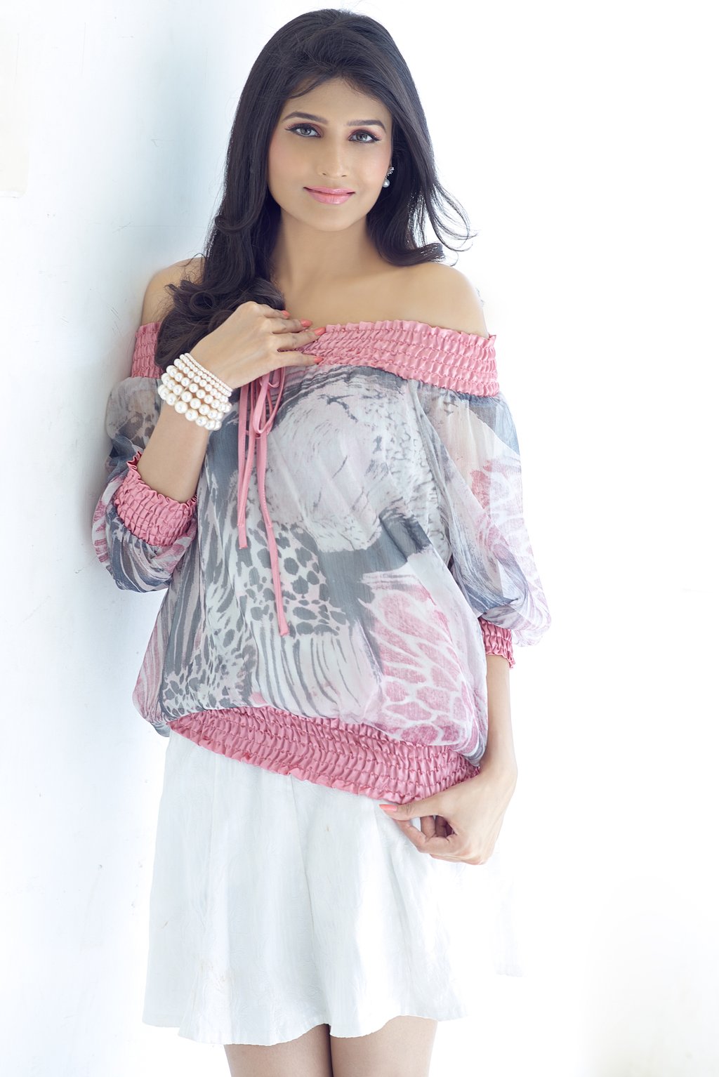 Kaavya Arivumani latest photoshoot stills wearing floral printed corset frock from ShriShe Designer Boutique. Captured by photographer Dhanush M.