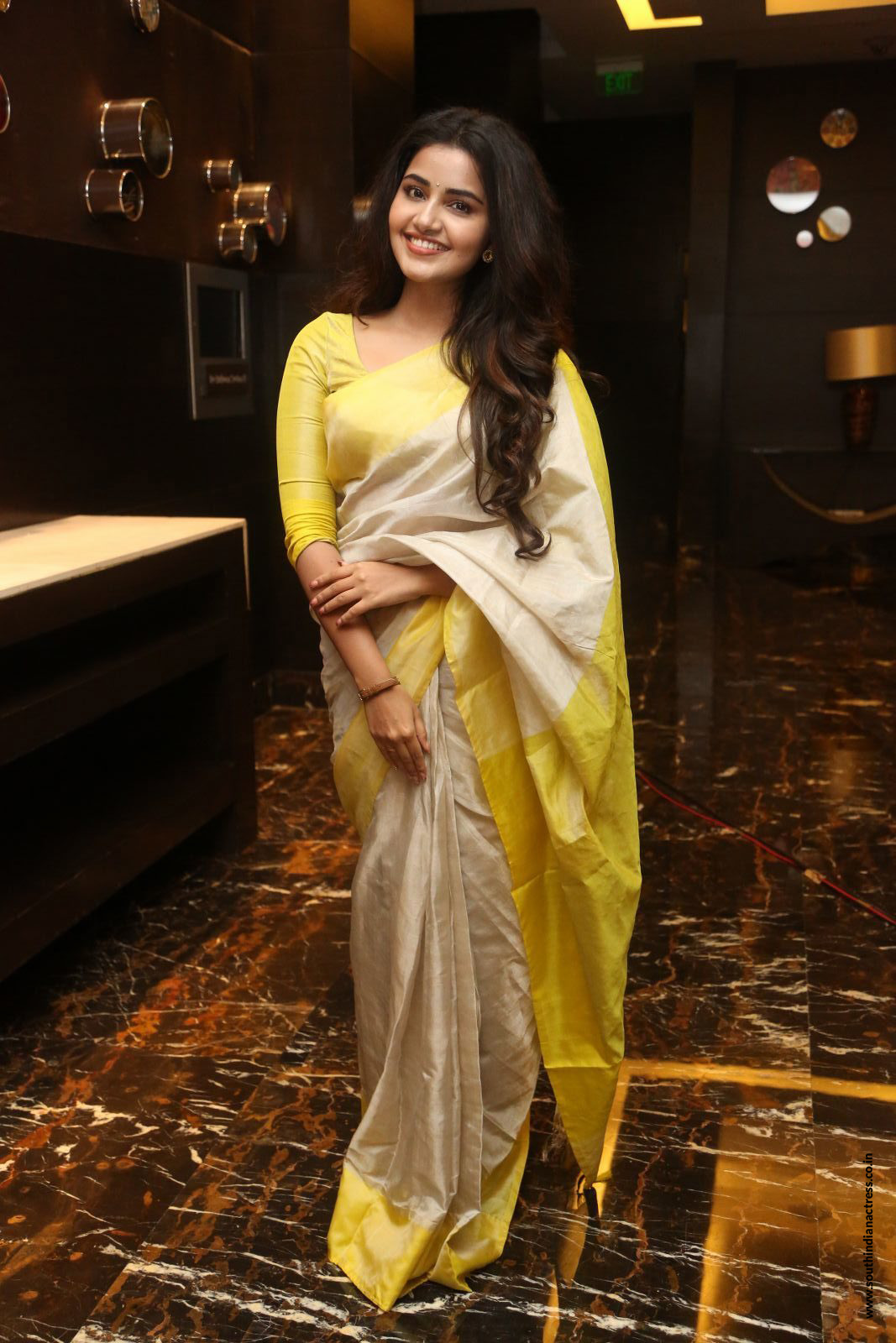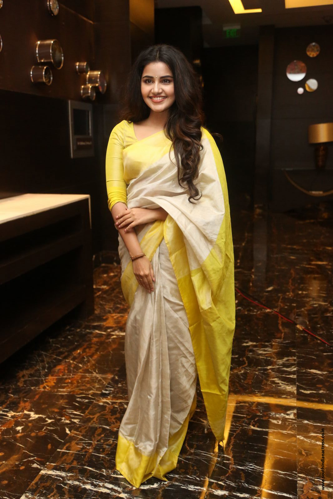 Anupama Parameswaran in yellow saree stills at her Telugu movie Karthikeya 2 Movie Success Press Meet event.