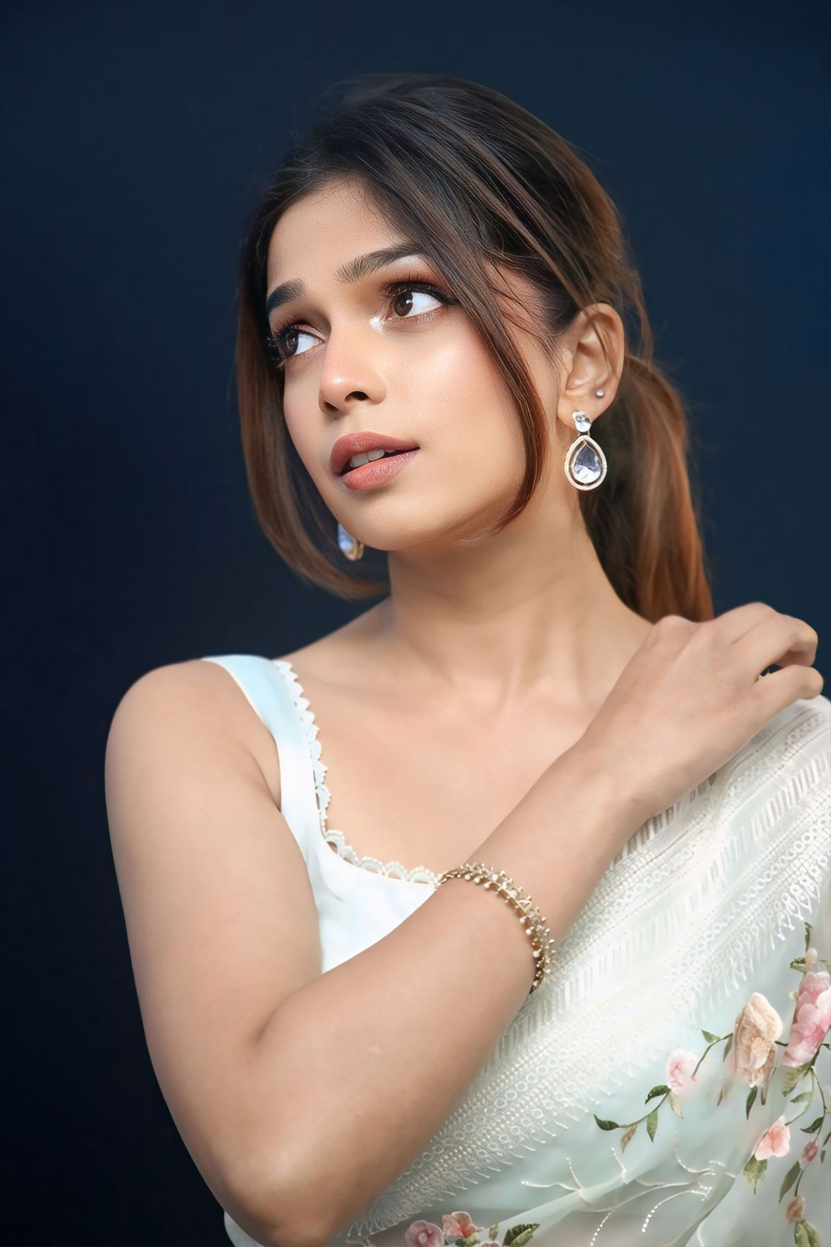 Ayaana chose a feminine look featuring a sheer mint green saree with pastel pink and peach floral patterns.