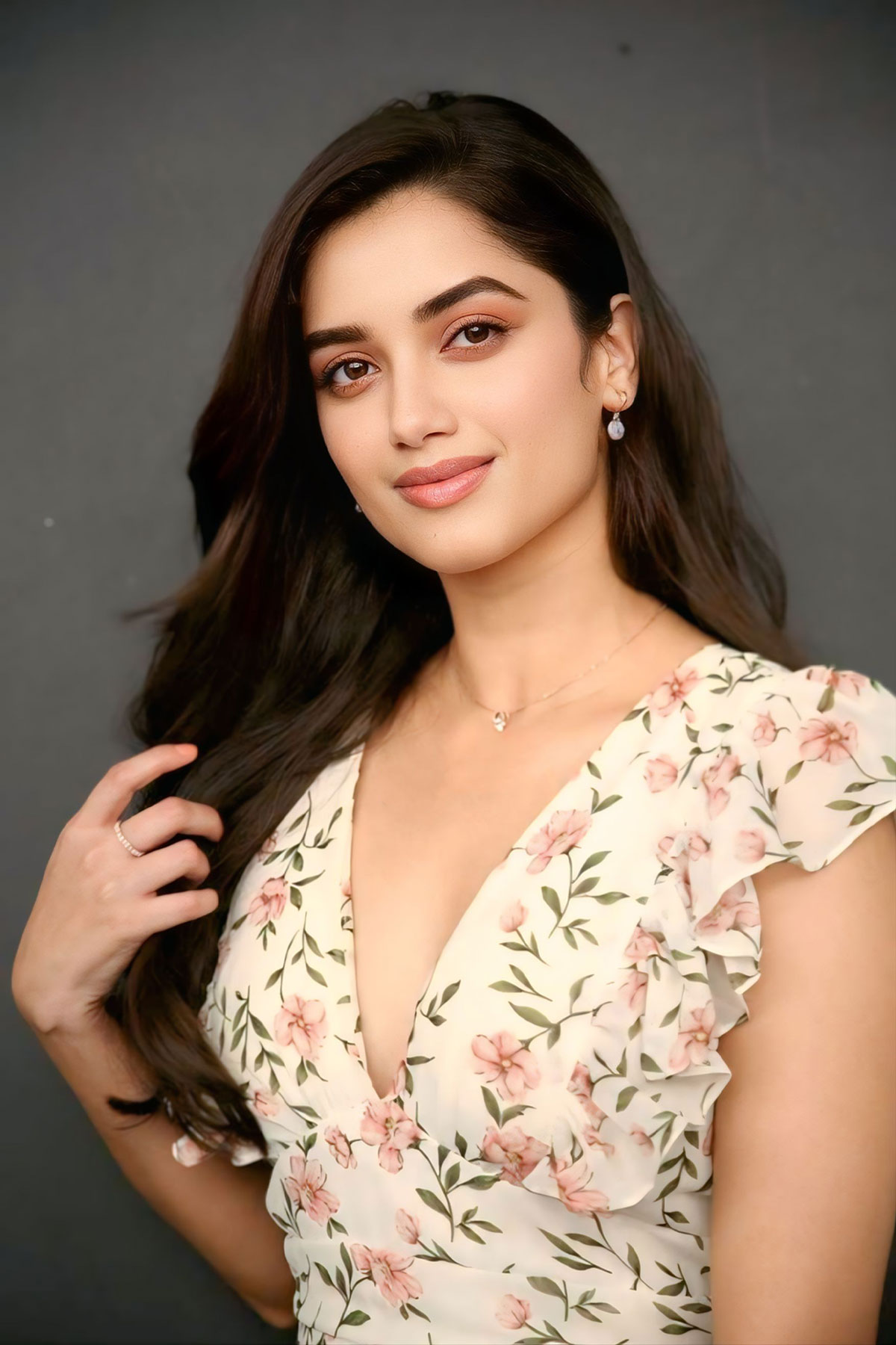Check out the latest stills of Bhagyashri Borse in a white maxi dress adorned with delicate pink floral print and green foliage.