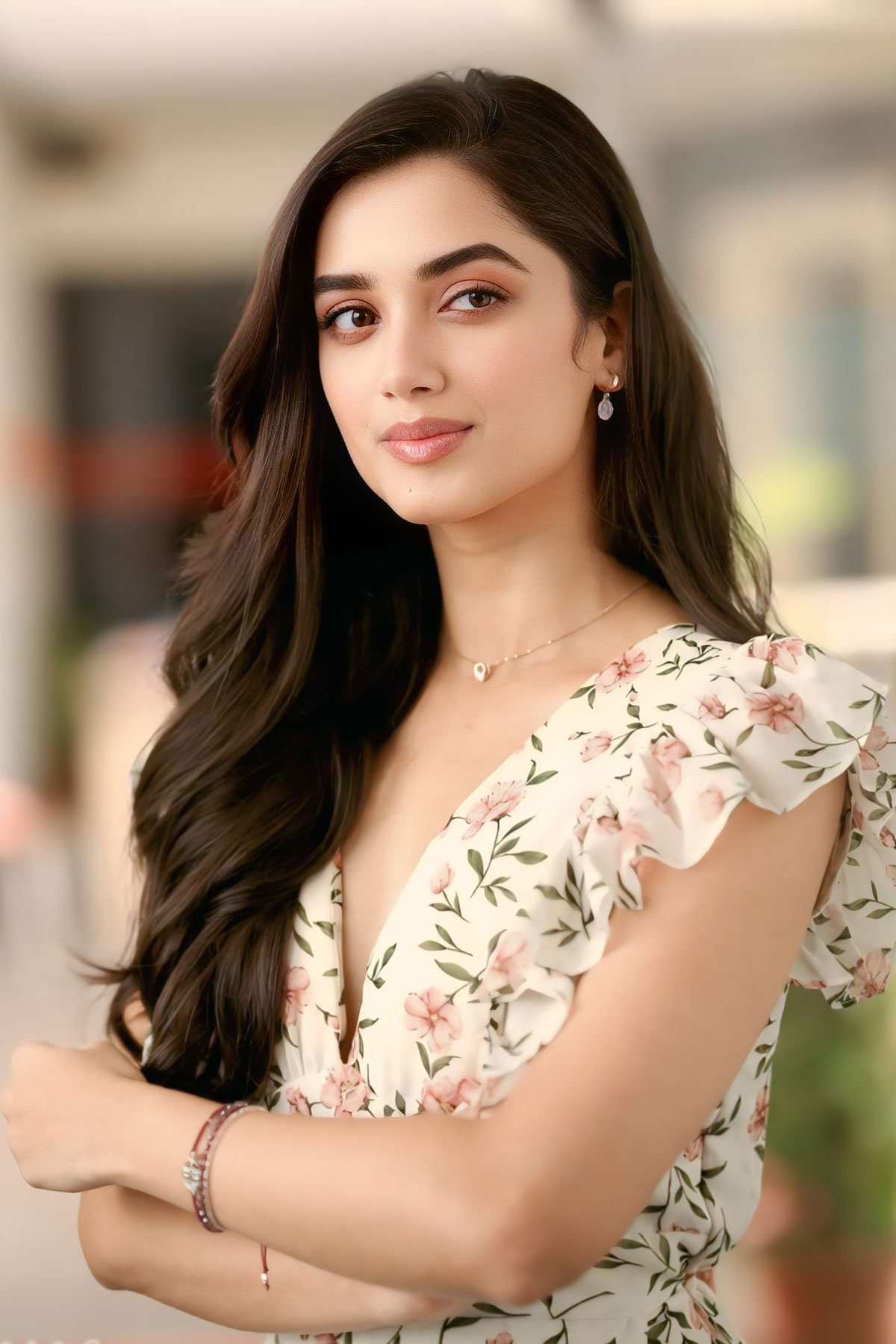 Bhagyashri Borse looked lovely in a white dress with pink floral print and green foliage during her Andhra King Taluka interview.