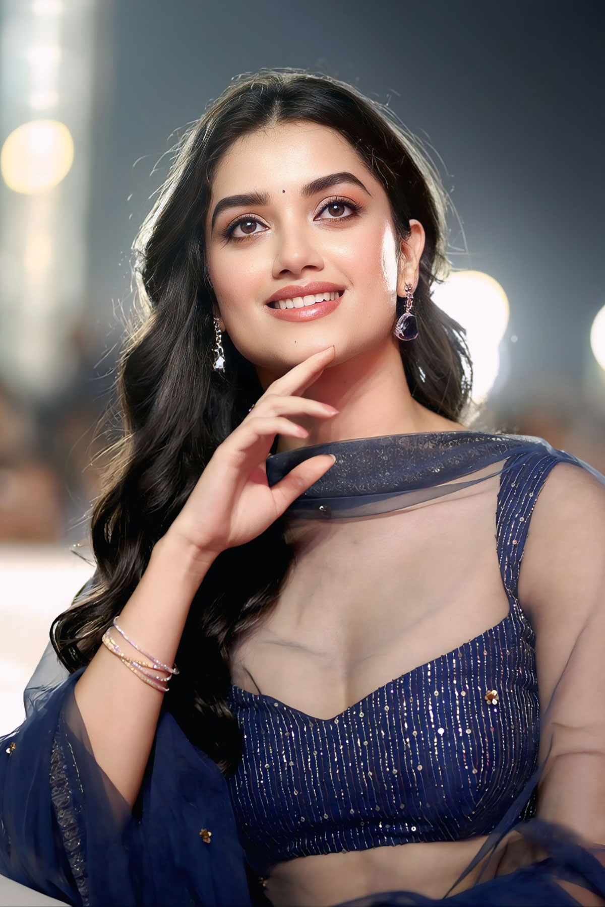 Bhagyashri Borse captivated the audience in a shimmering sequined blouse and deep blue lehenga at the grand musical event for her upcoming film.