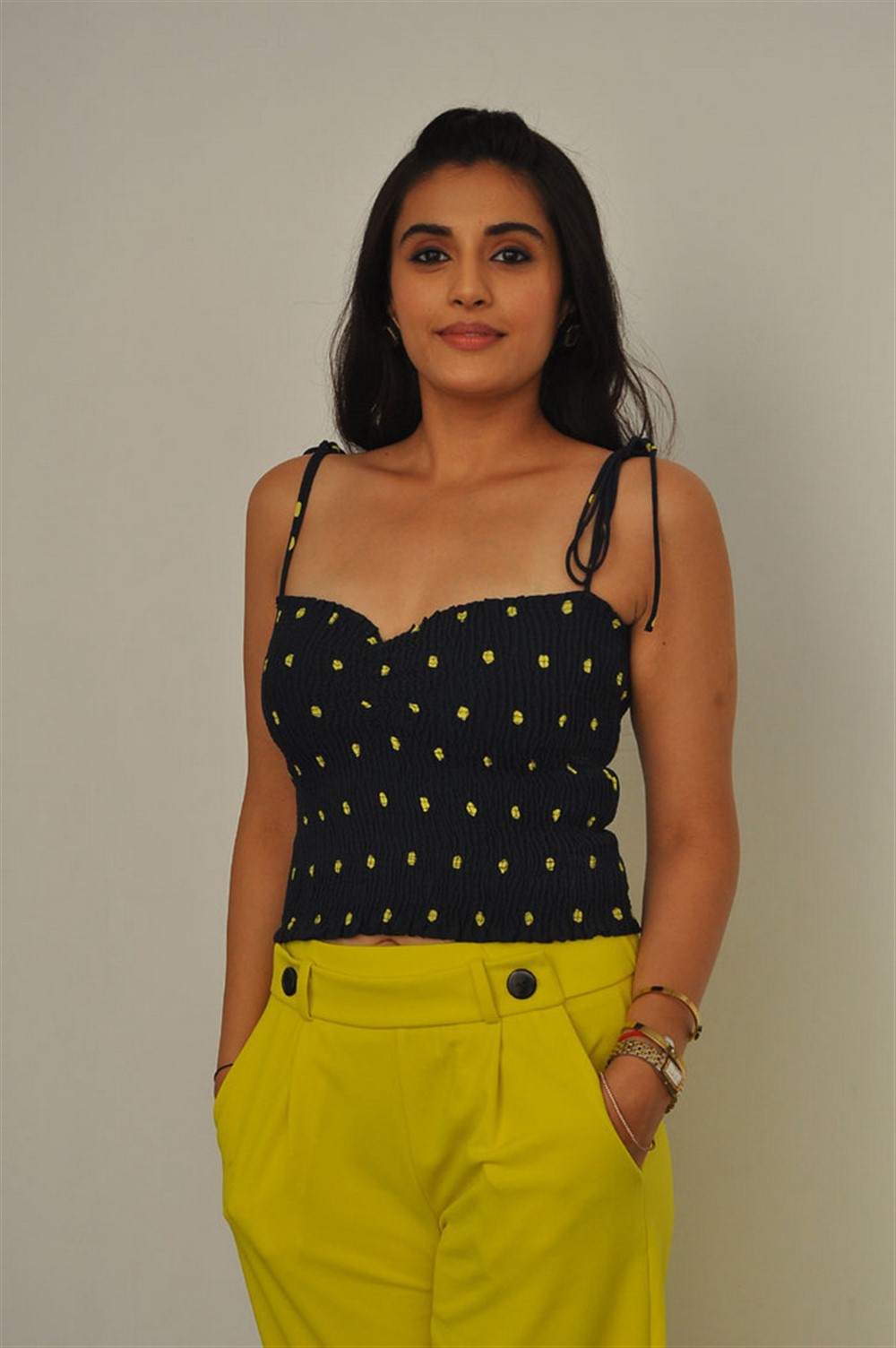 Divyansha Kaushik hot stills in yellow short dress at her upcoming Telugu movie Ramarao On Duty press meet interview.
