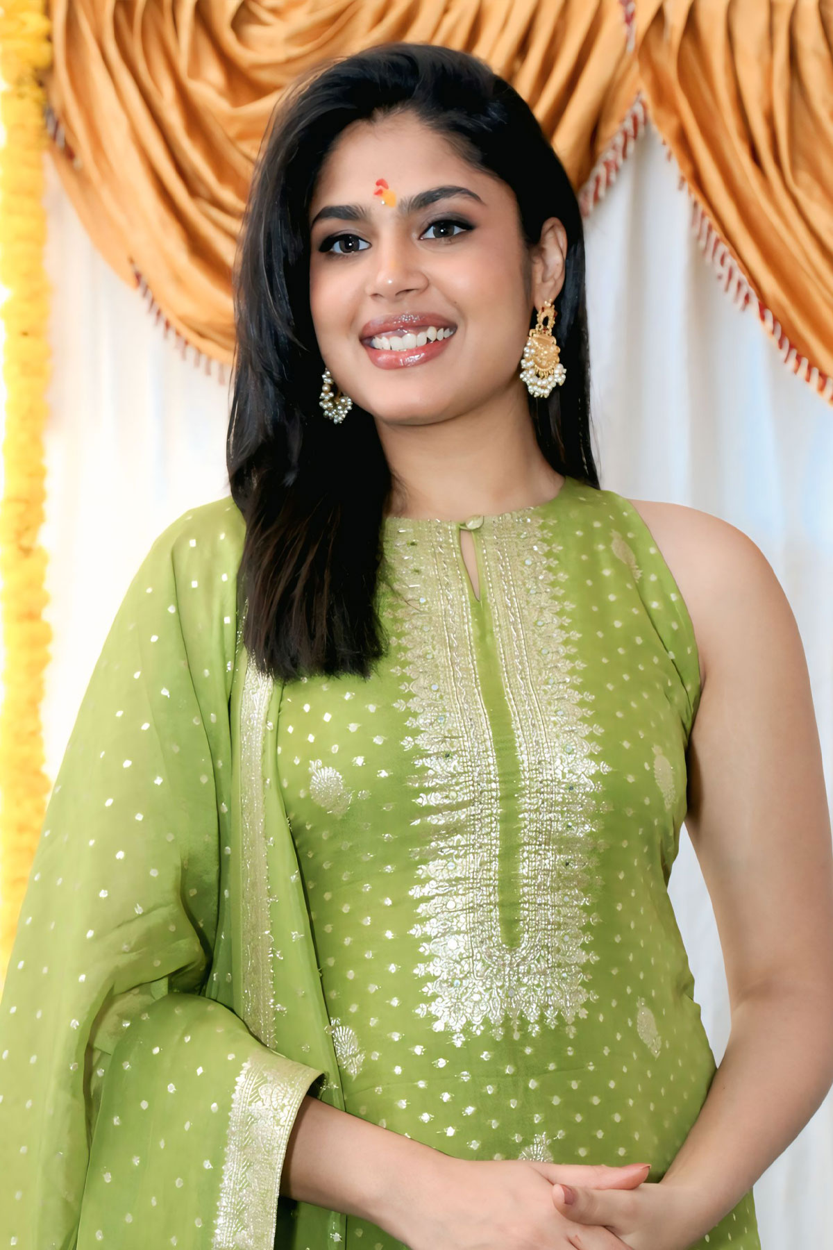 Faria Abdullah rocks a seamless monochromatic look in matching straight-cut olive green pants and a high-quality silk sleeveless kurta.