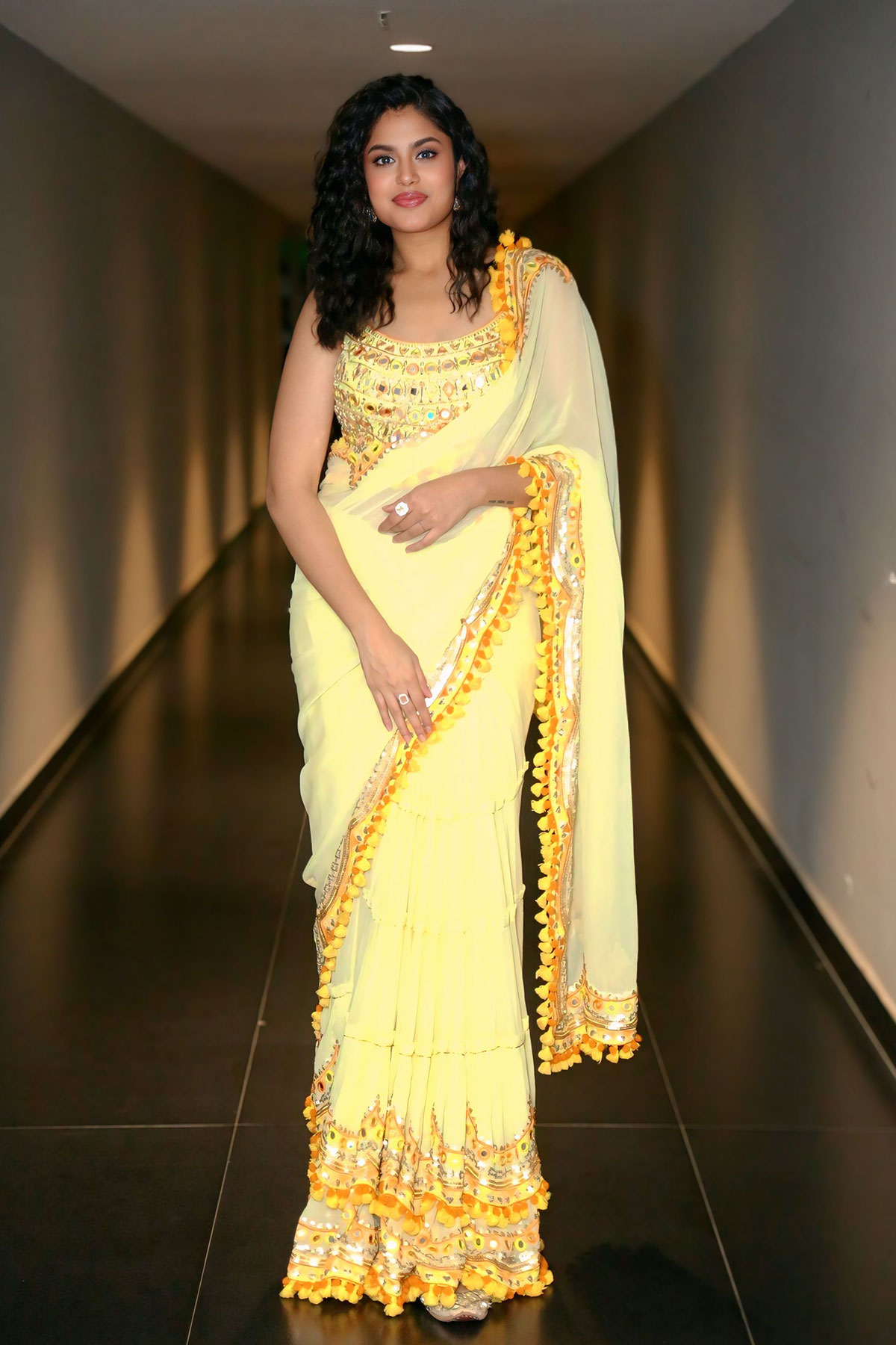Actress Faria Abdullah styled her famous voluminous curls with a fresh, dewy makeup look for the Gayapadda Simham promotional event.
