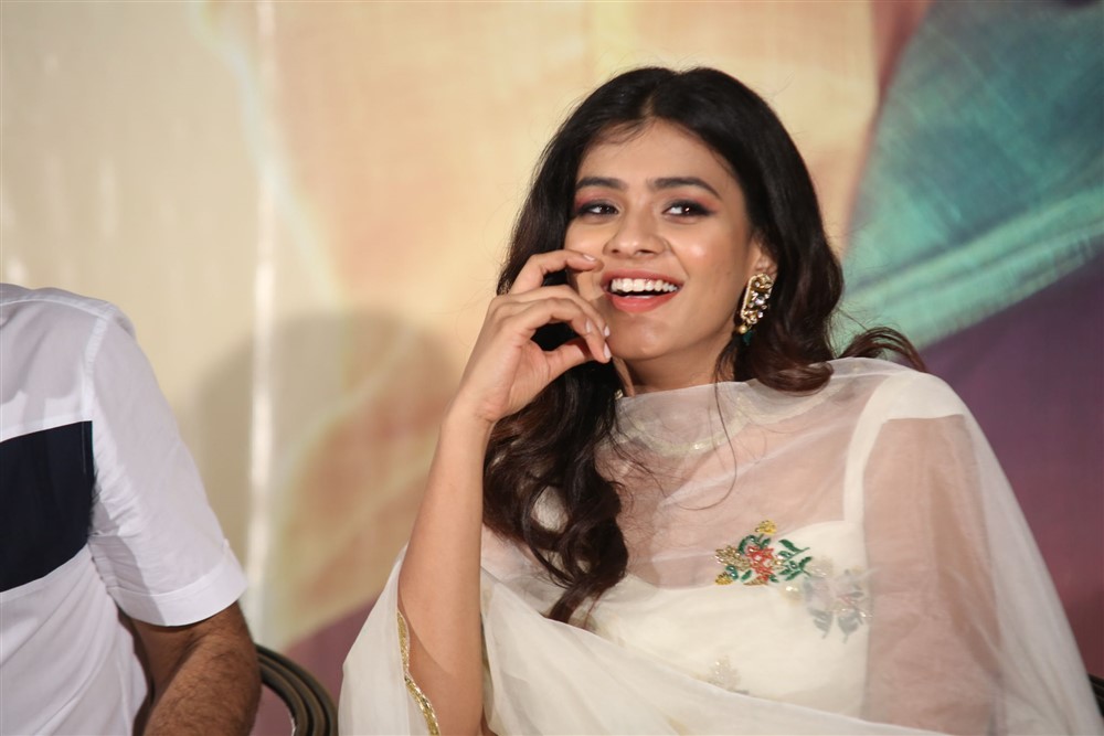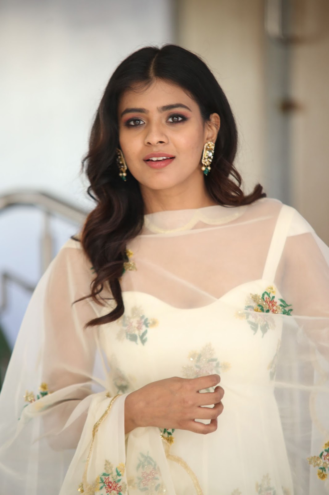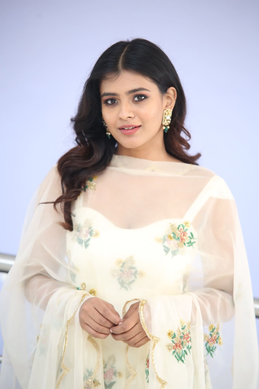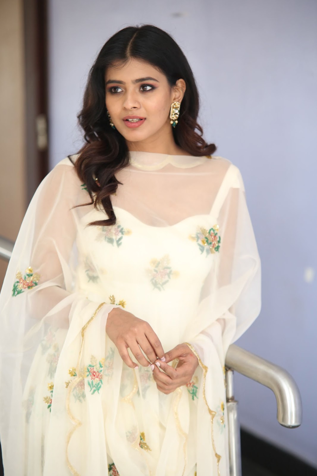 Hebah Patel Stills From 24 Kisses Movie Trailer Launch. Hebah Patel attended the event wearing an off-white embroidered anarkali suit by EASE. A pair of gold juttis, polki diamond earrings and wavy hair rounded out her look!