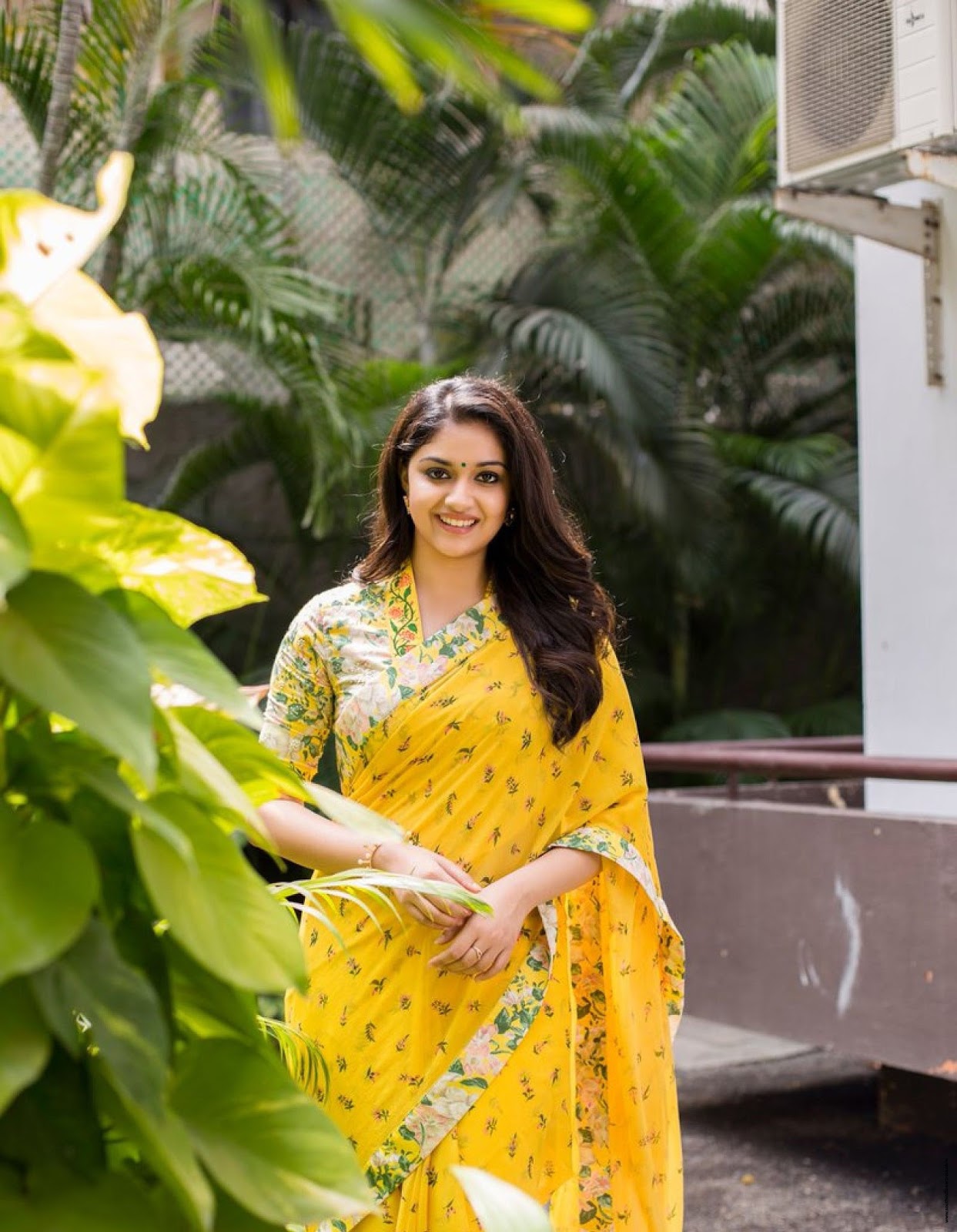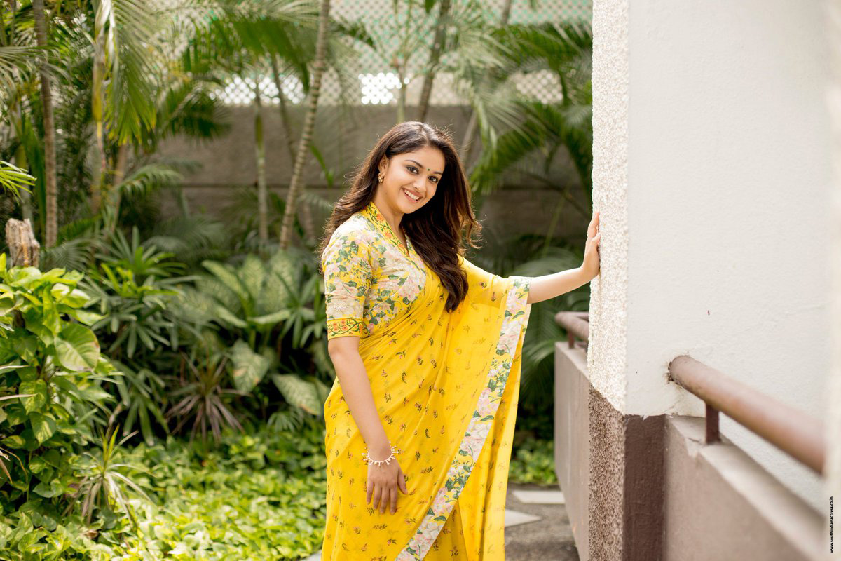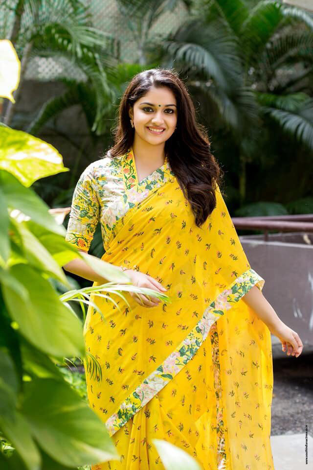 Keerthy Suresh in yellow saree photos at Nadigaiyar Thilagam movie Promotions
