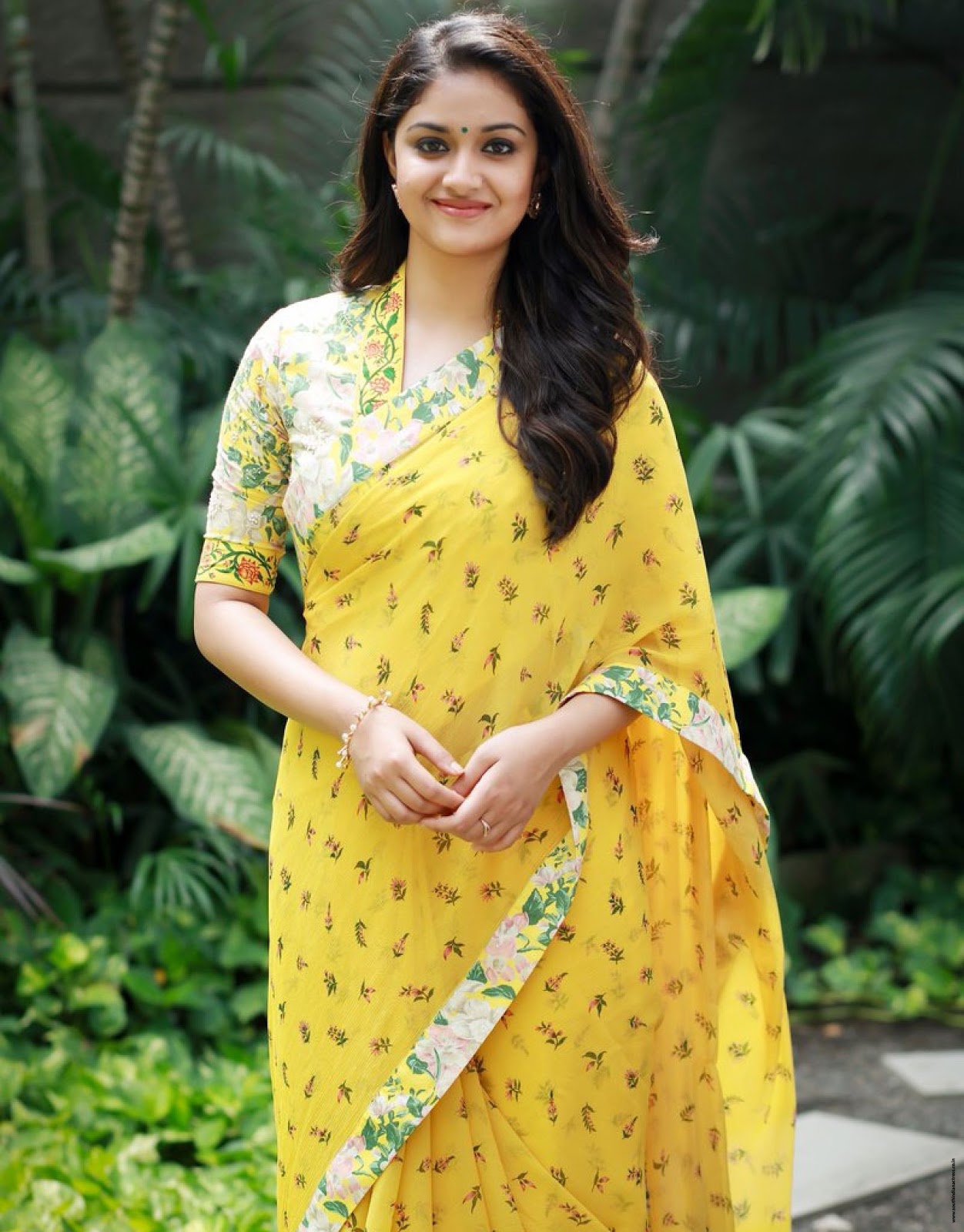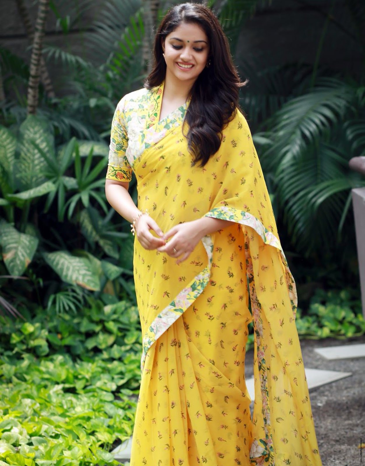 Keerthy Suresh in saree stills at her upcoming Telugu movie Bhola Shankar Pre Release Event.