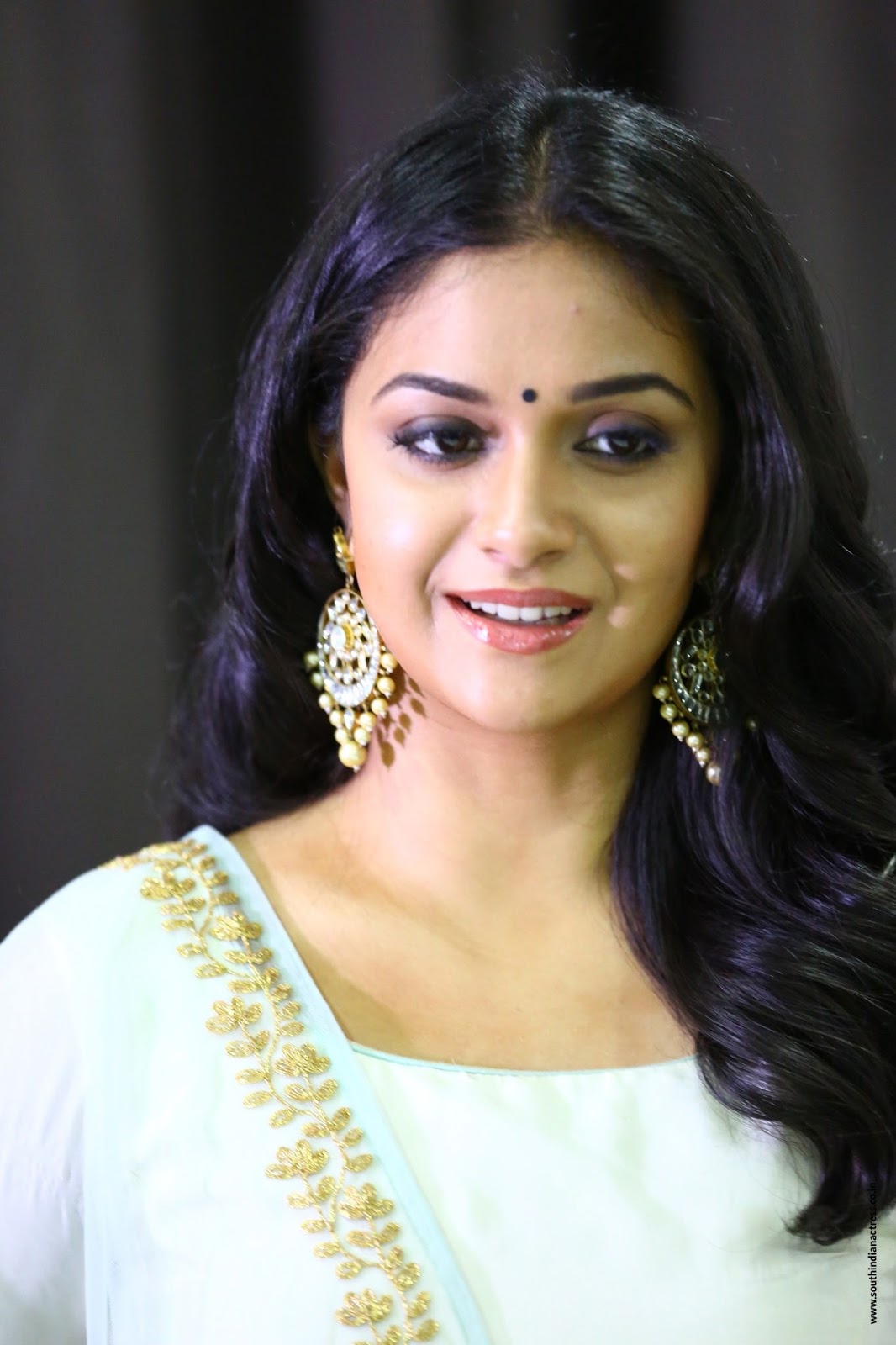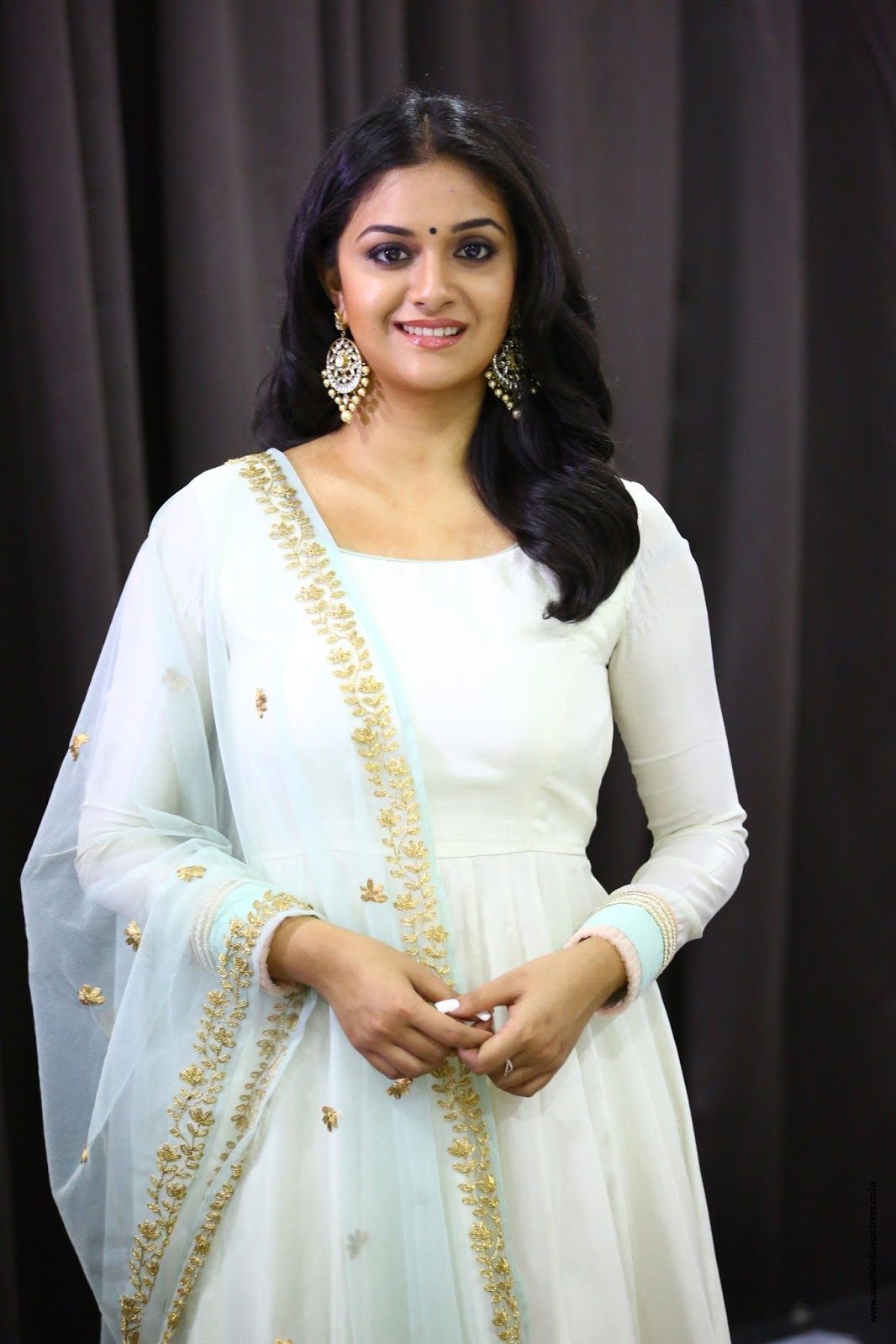 Keerthy Suresh stills at the promotion of Thaana Serndha Koottam movie wearing a white Vaishali Couture Anarkali & a pretty Taavare Clothing dupatta, finishing her look with jadao earrings from Amethyst