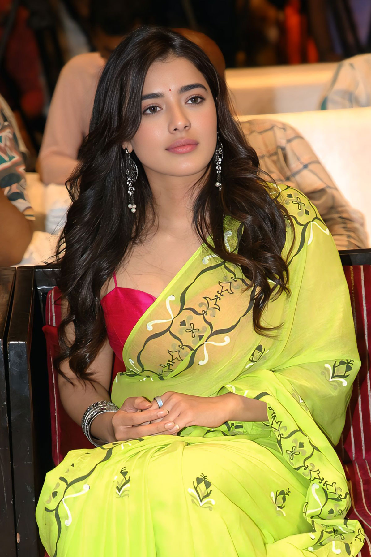 At the Telugu movie Single press meet, Ketika Sharma impressed in a glowing green saree paired with silver accessories.