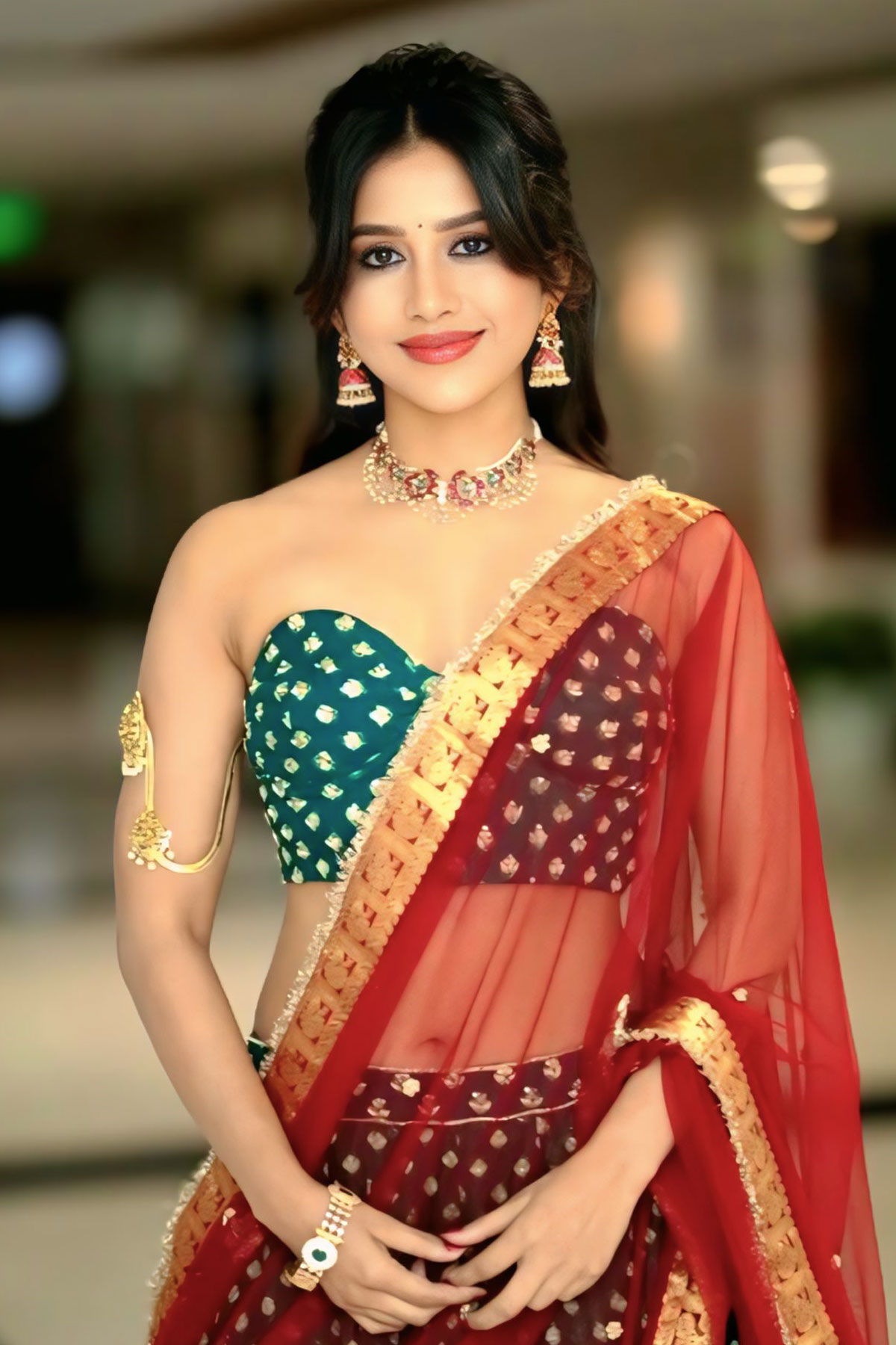 Nabha Natesh turned up the heat in a heavily embellished off-shoulder blouse and revealing her navel, balancing modern glamour with traditional aesthetics.