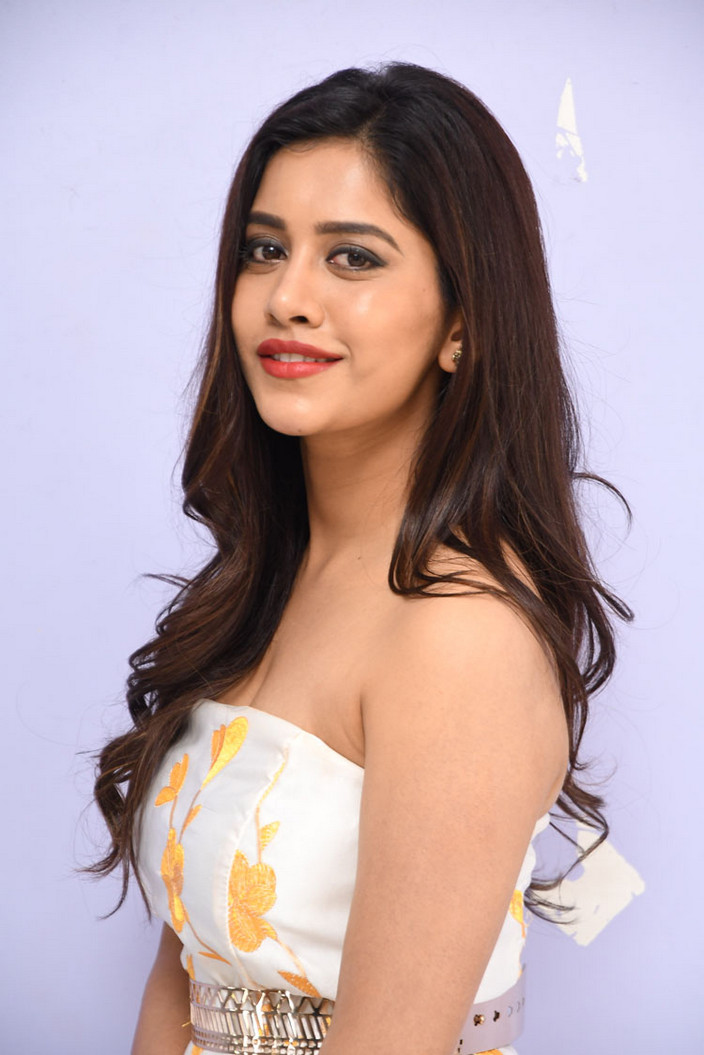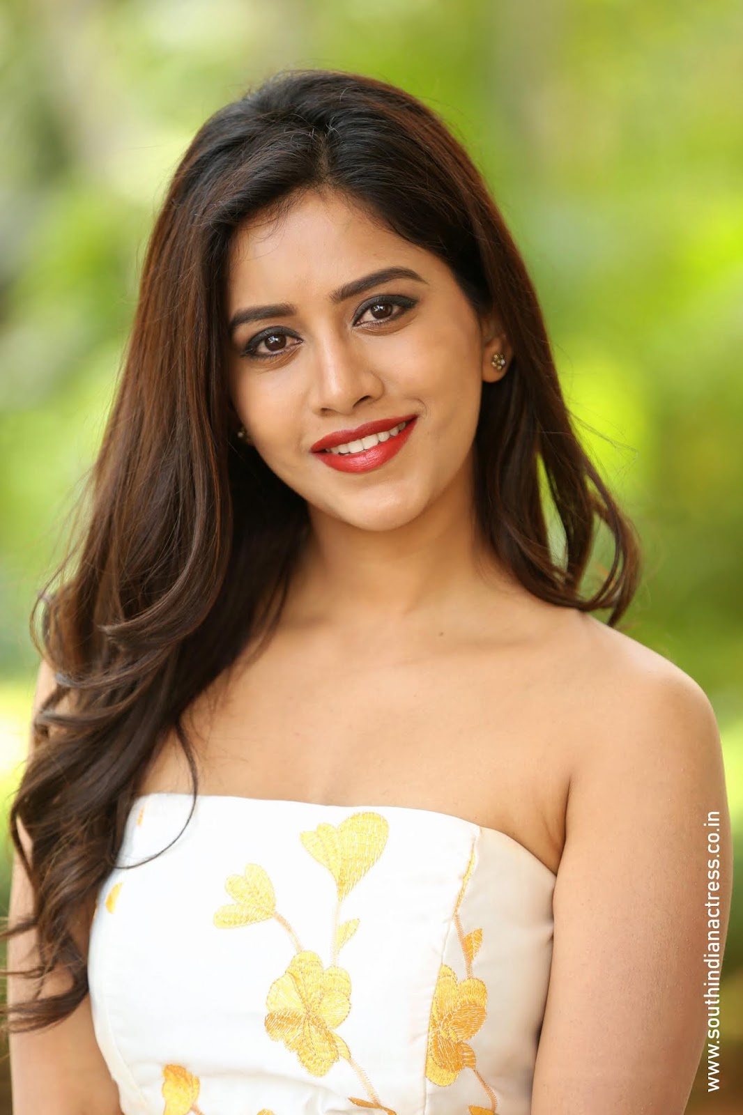 Nabha Natesh stills at Nannu Dochukunduvate movie Success Meet. Kannada Actress Nabha Natesh in off shoulder floral white dress at her first movie Nannu Dochukundvate movie success meet.