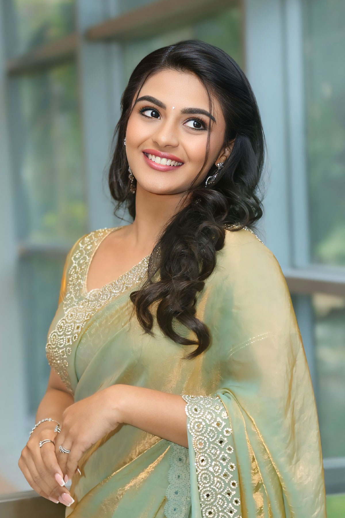 Check out the stunning silver and gold ethnic embroidery on Nayan Sarika’s V-neck blouse, perfectly complementing her shimmering green saree.
