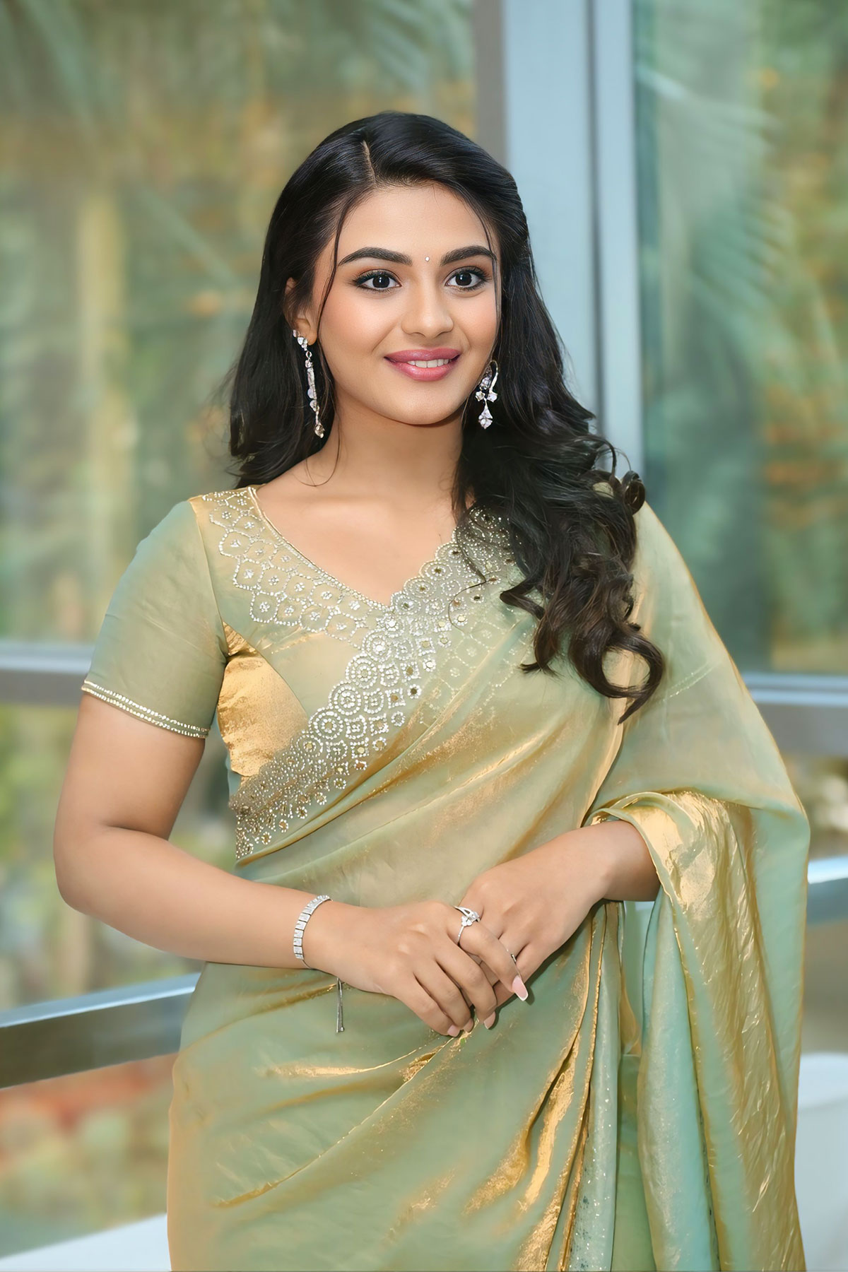 See Nayan Sarika light up the promotional event in a luxurious shimmering green saree that perfectly captures her elegant and festive vibe.