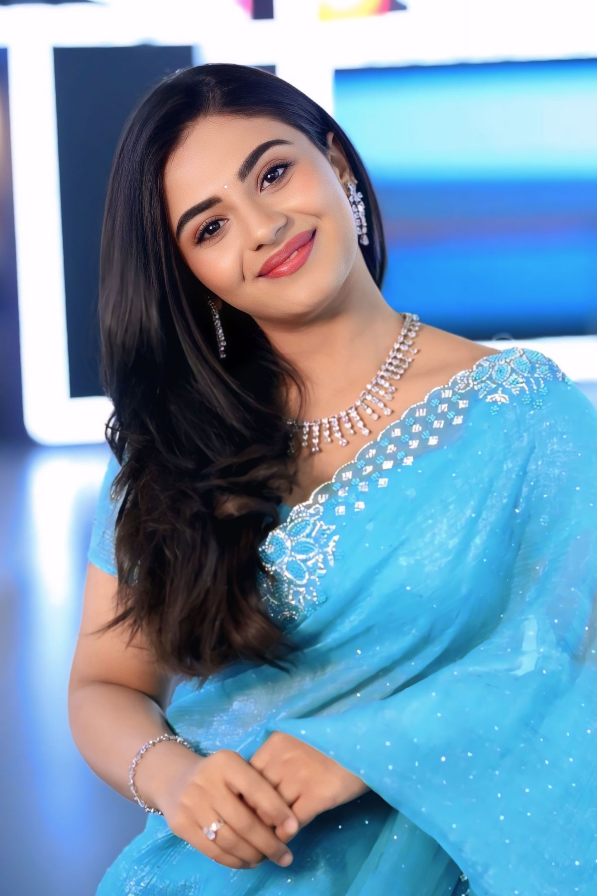 Leading lady Nayan Sarika mesmerizes fans with her poised and polished nivi style drape in a stunning sky blue metallic sheen saree.