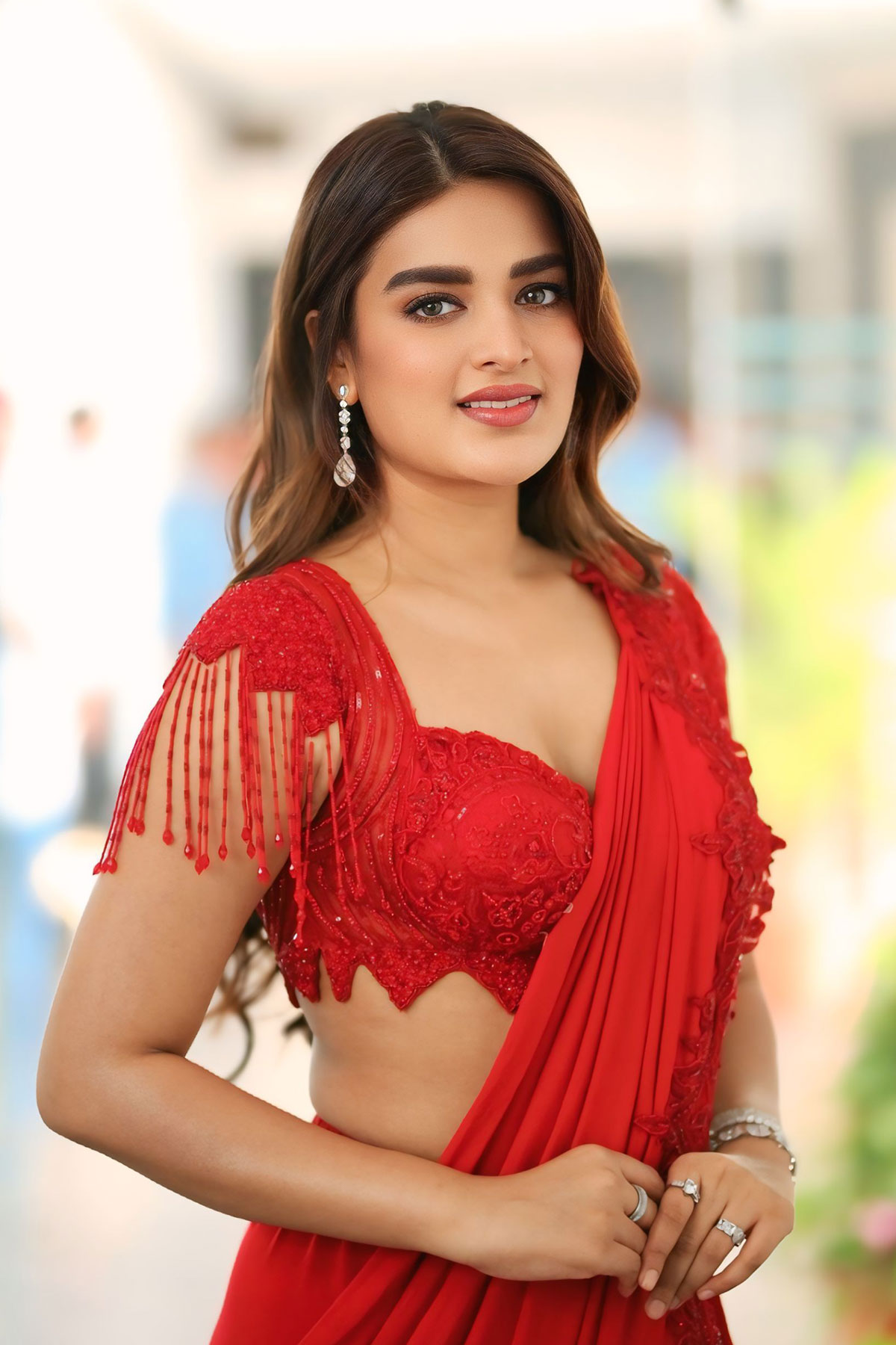 Nidhhi Agerwal captivating stills in a sizzling Scarlet Red Drape Saree, taken during her promotional interview circuit for Hari Hara Veera Mallu.