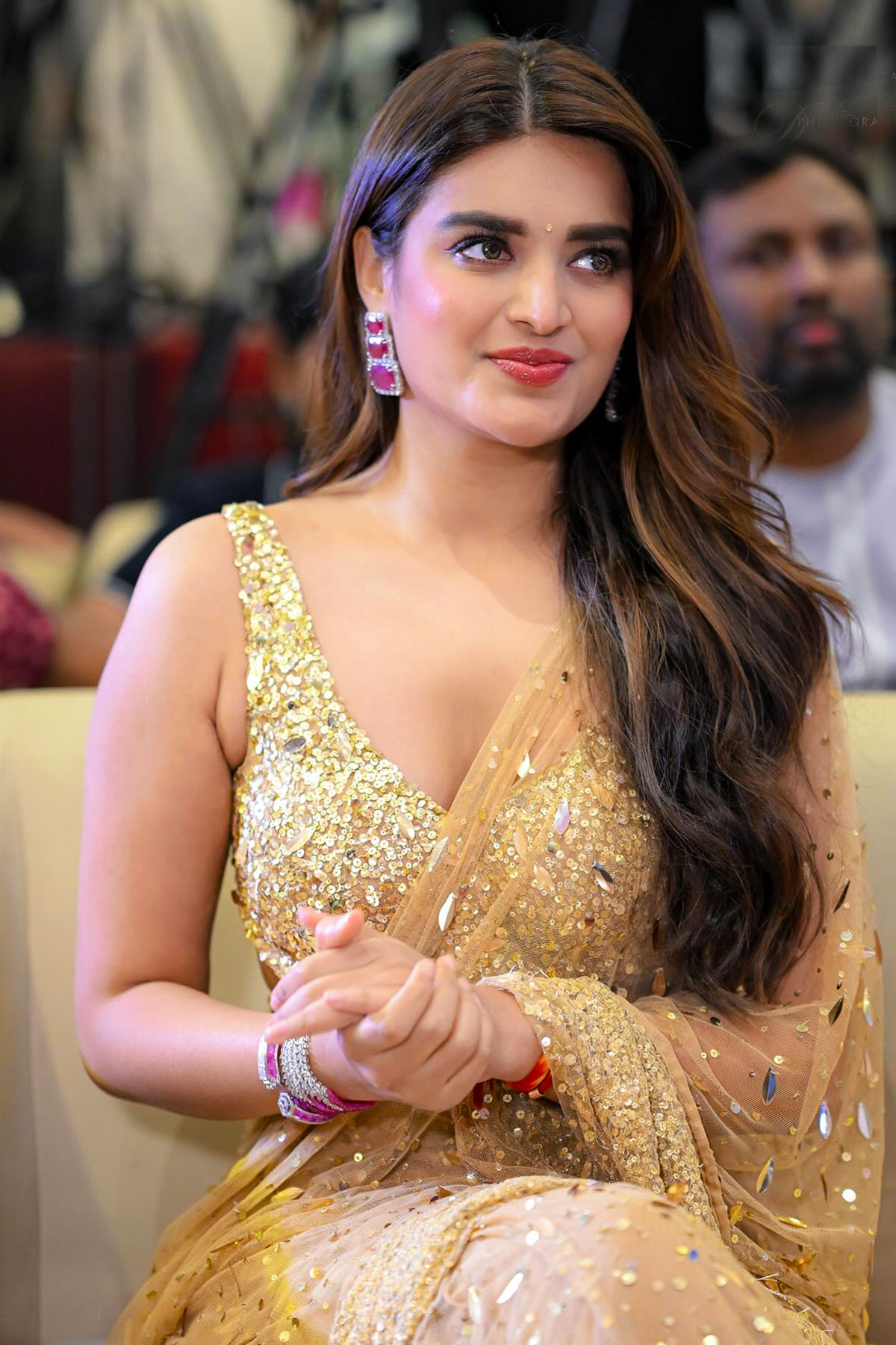 Nidhhi Agerwal in Elegant Gold Saree for Hari Hara Veera Mallu Celebrations