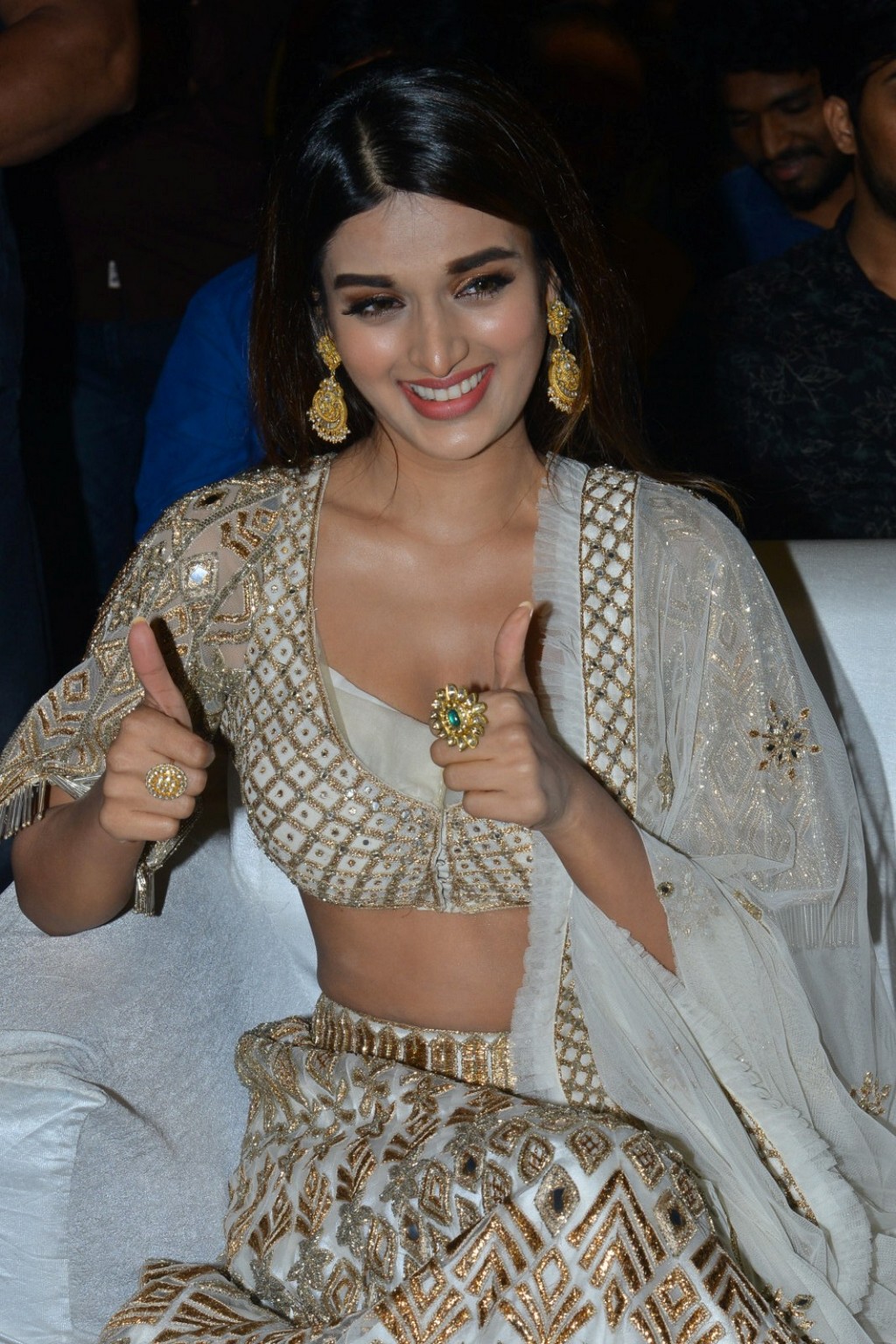 Nidhhi Agerwal stills in white lehenga at Telugu movie Hari Hara Veera Mallu pre release event.