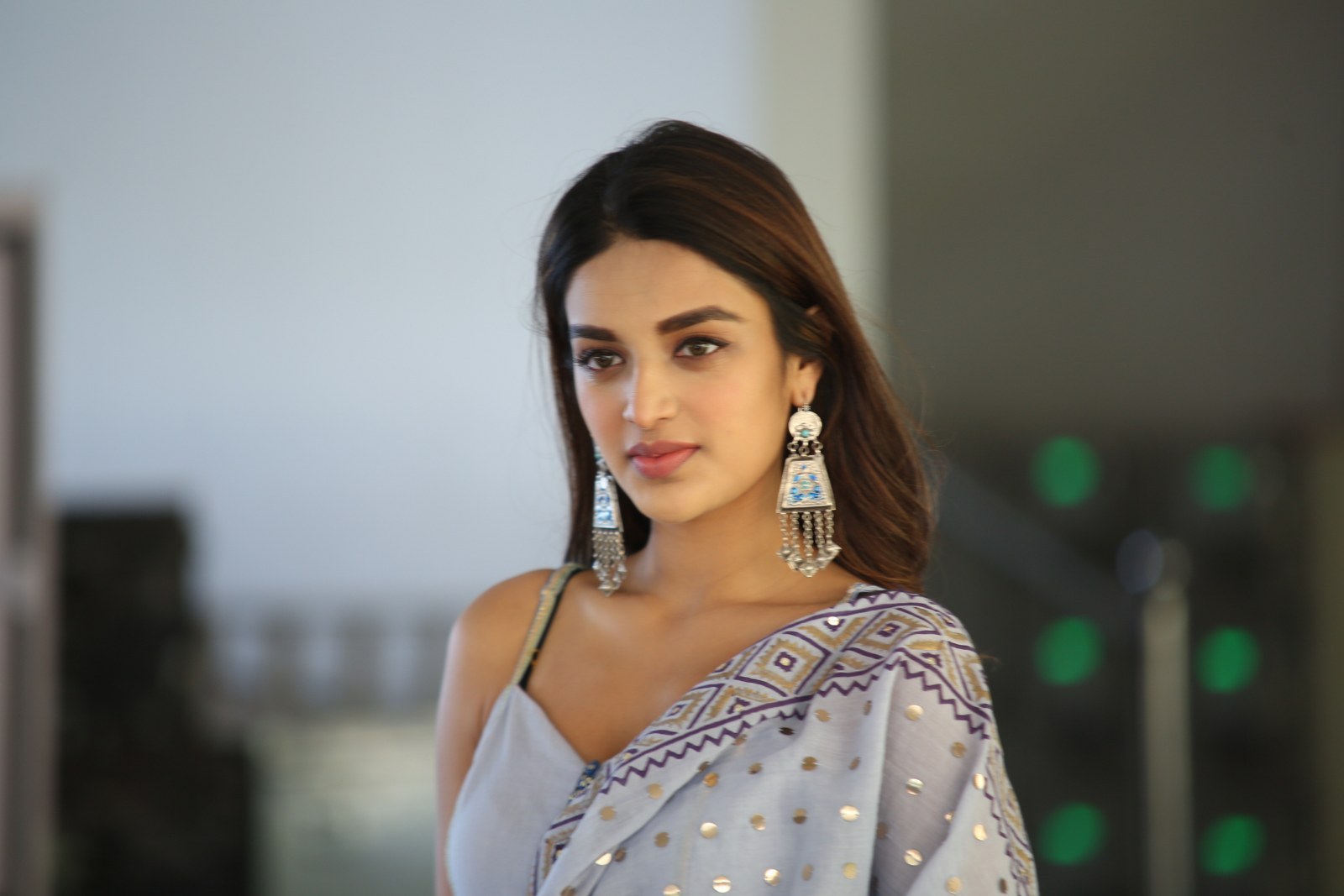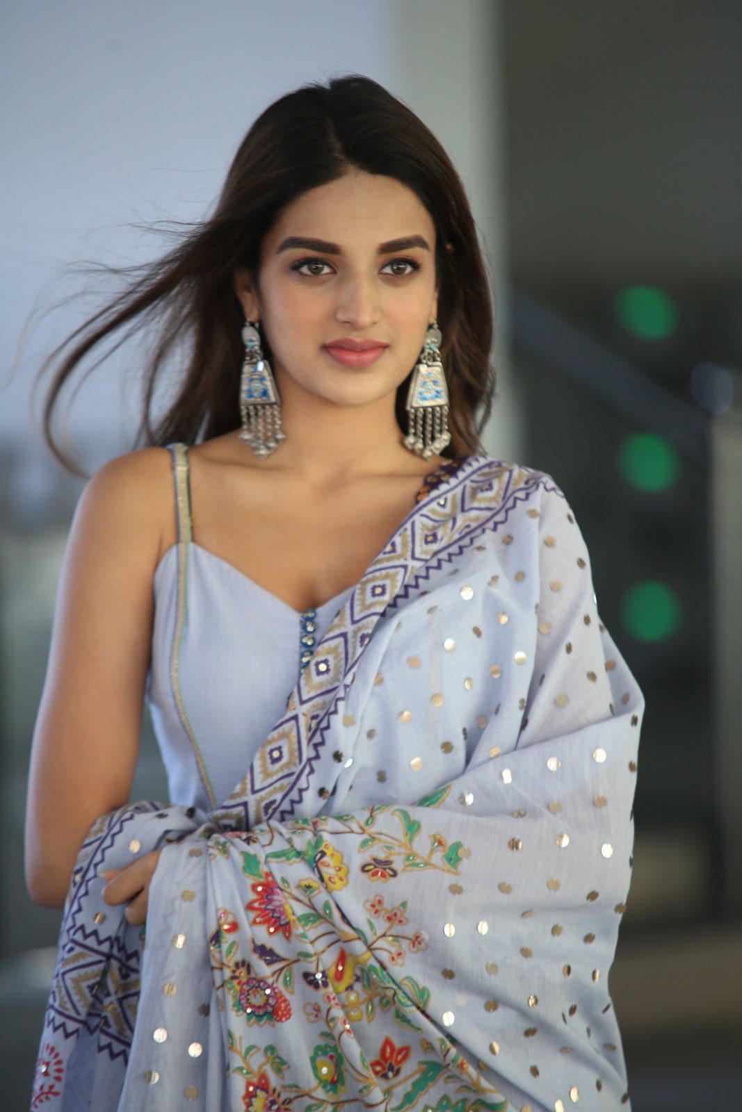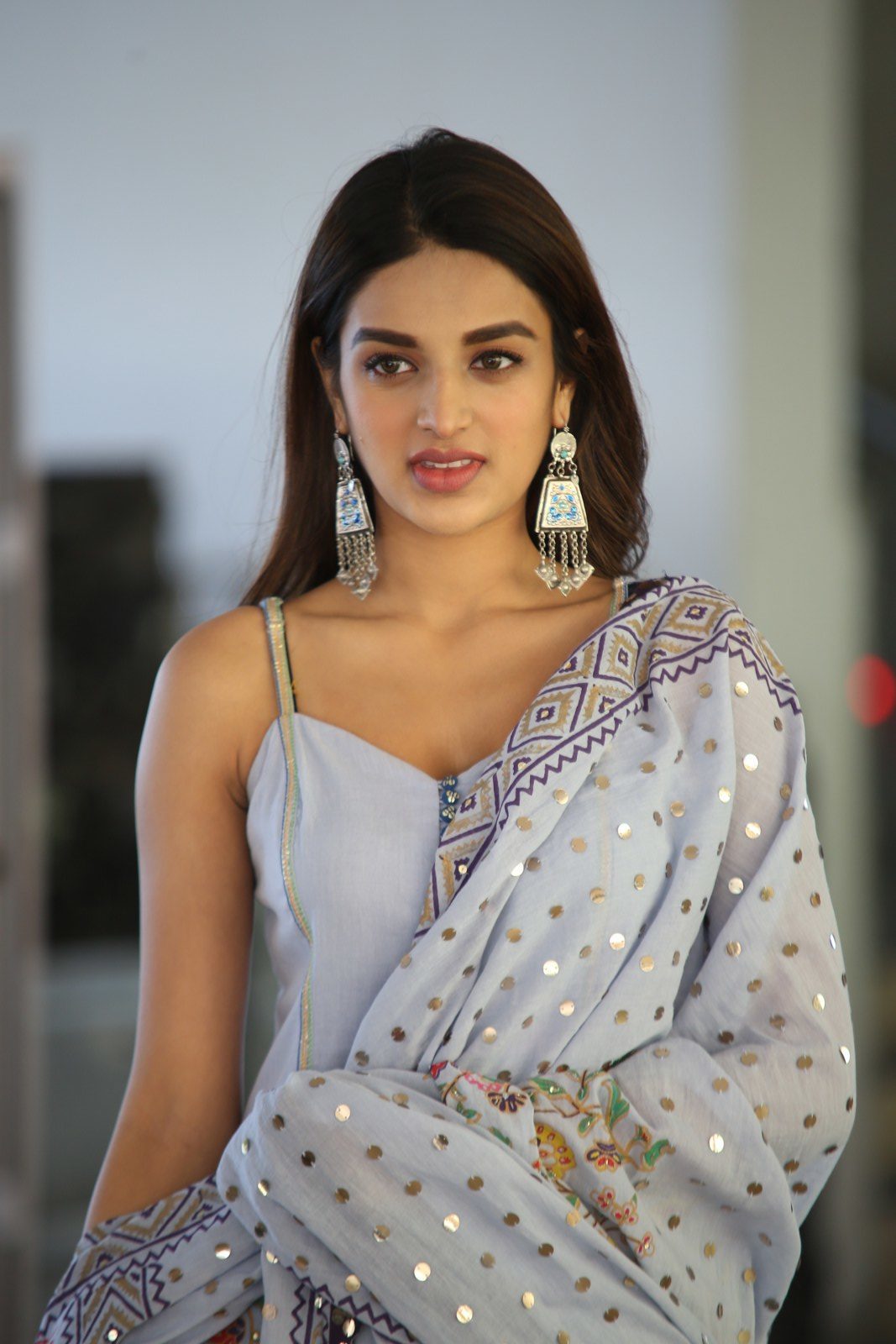 Nidhhi Agerwal stills at Savyasachi movie Interview. Nidhhi Agerwal wore a blue sharara suit by Sukriti & Aakriti. A pair of silver earrings and straight hair rounded out her look!