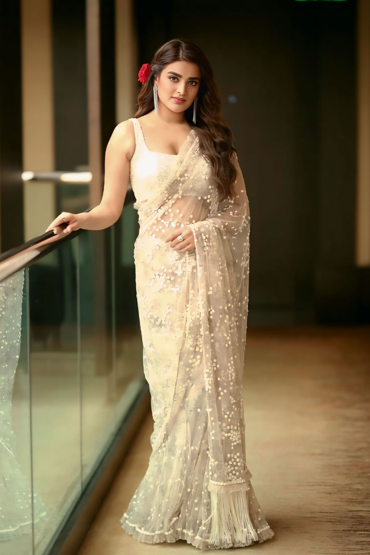 Nidhhi Agerwal Radiates in Sheer Off-White Saree for Press Meet