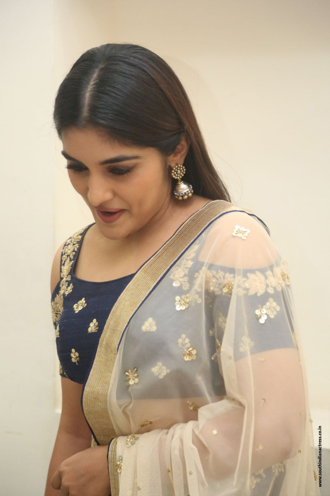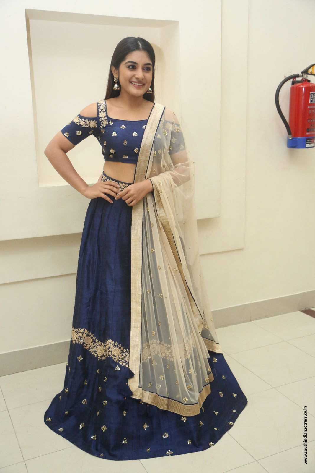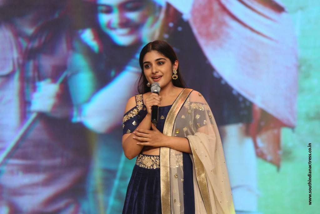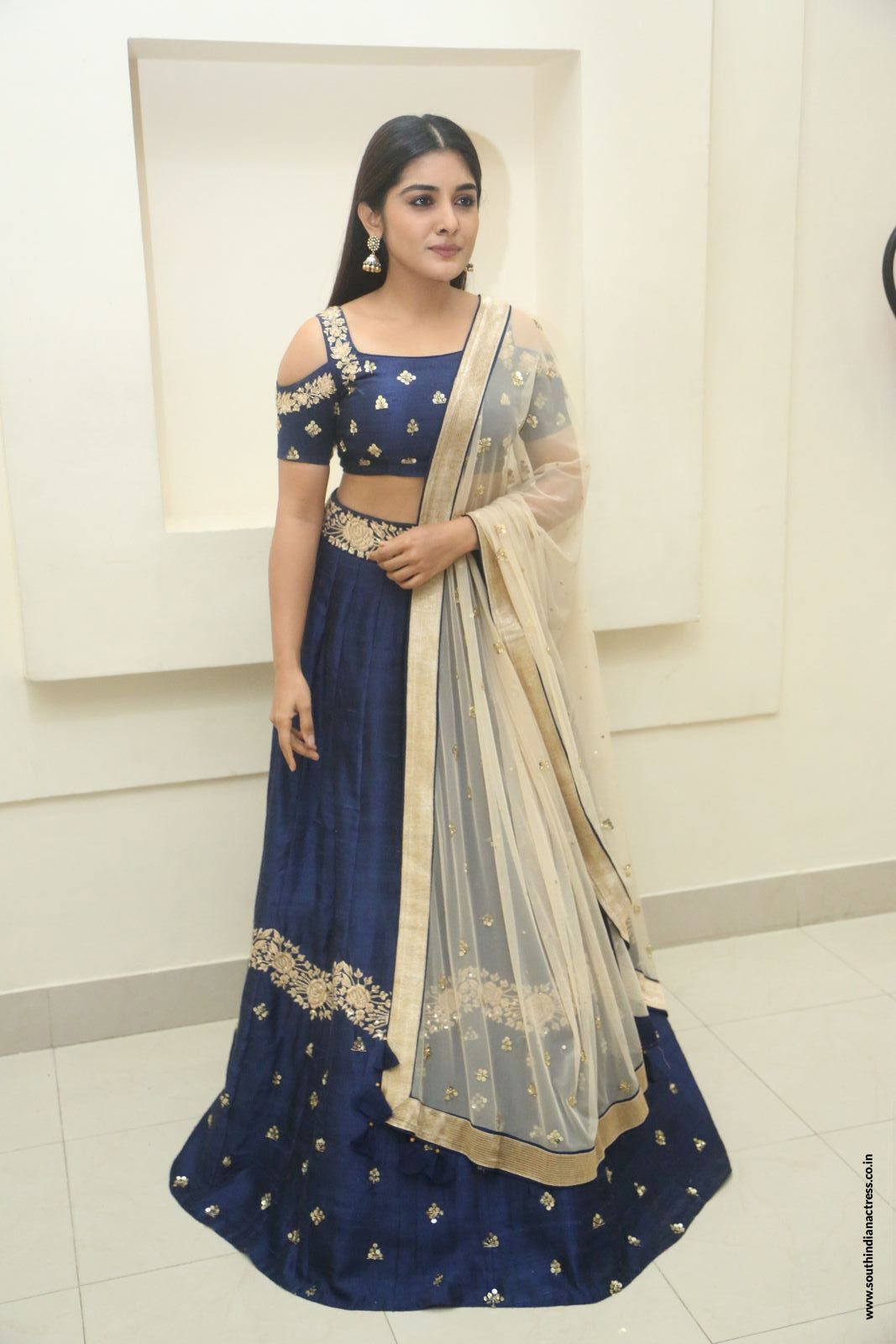 At Jai Lava Kusa pre release, actress Niveda Thomas looked royal in a royal blue cold shoulder embellished lehenga by Mishru Designs. Jhumkas by Fab India enhanced her ethnic look. Mauve lips and center parted straight hair-do set her rock.