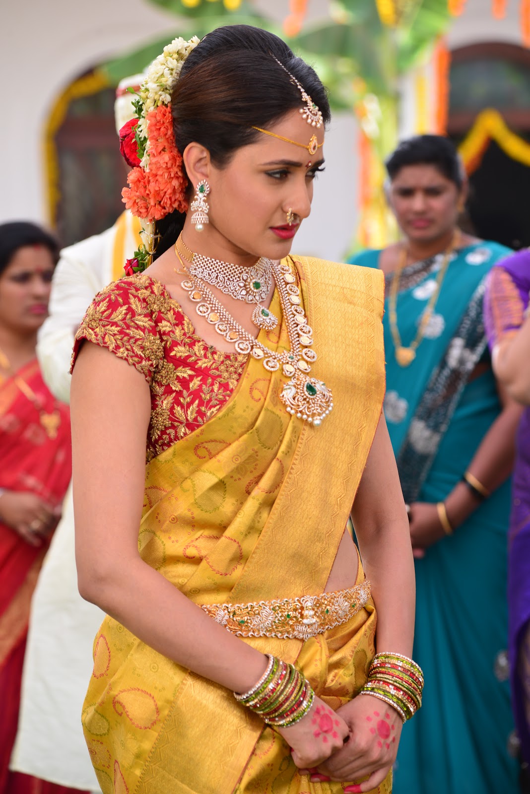 Pragya Jaiswal in yellow embroidered lehenga stills at Telugu movie Akhanda success meet.