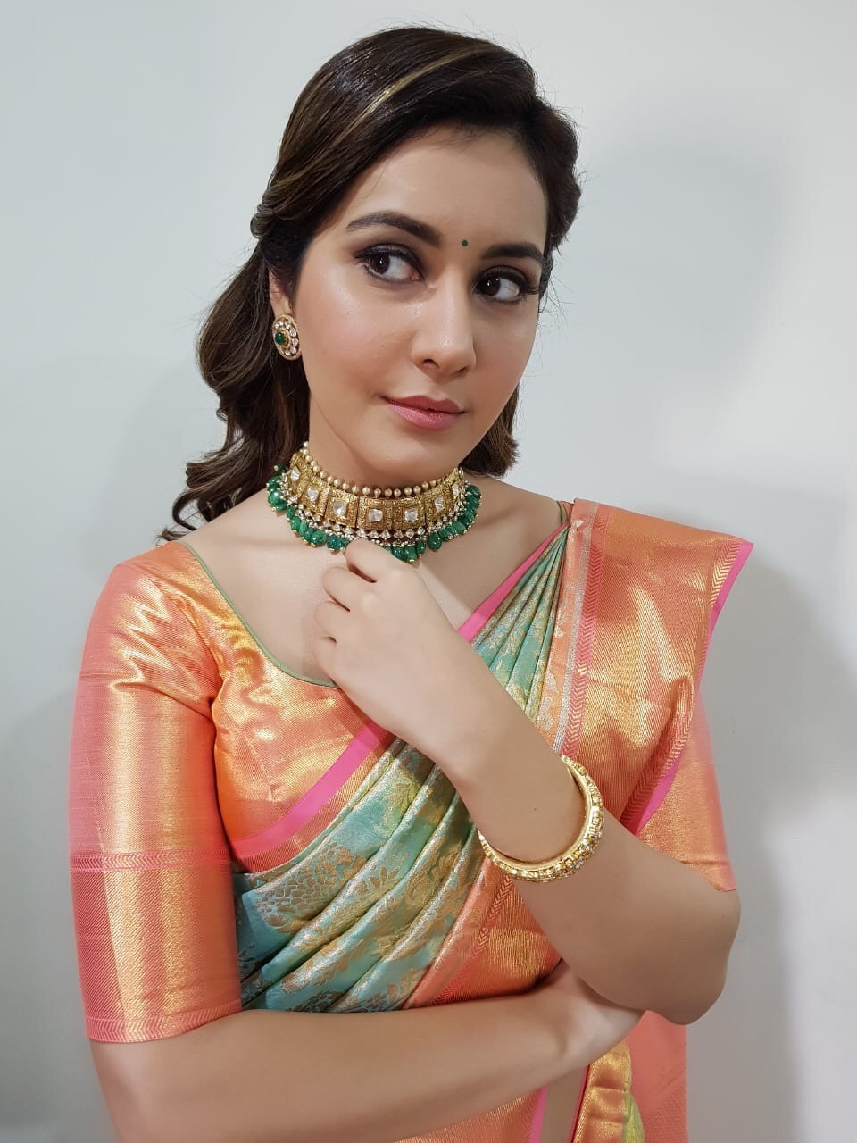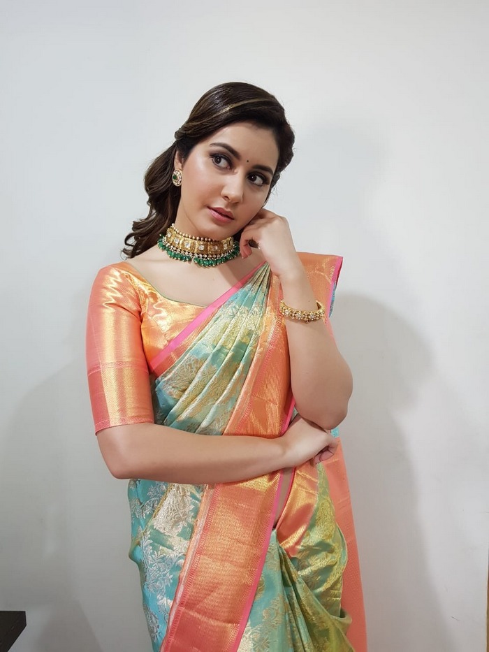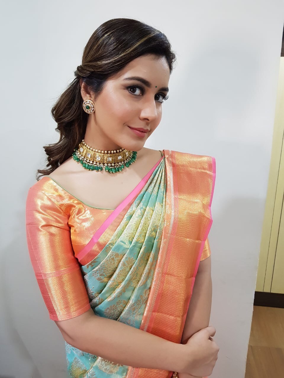 Telugu Actress Raashi Khanna stills at Kalyanalakshmi Shopping Mall Warangal Grand Opening. Raashi Khanna attended the event wearing a mint blue kanchi pattu saree that has gold zari border paired with matching elbow length sleeves blouse by Shravan Kummar. Antique choker set and bangle from Pavan Mor Jewellers and pinned back wavy hair-do rounded out her look!