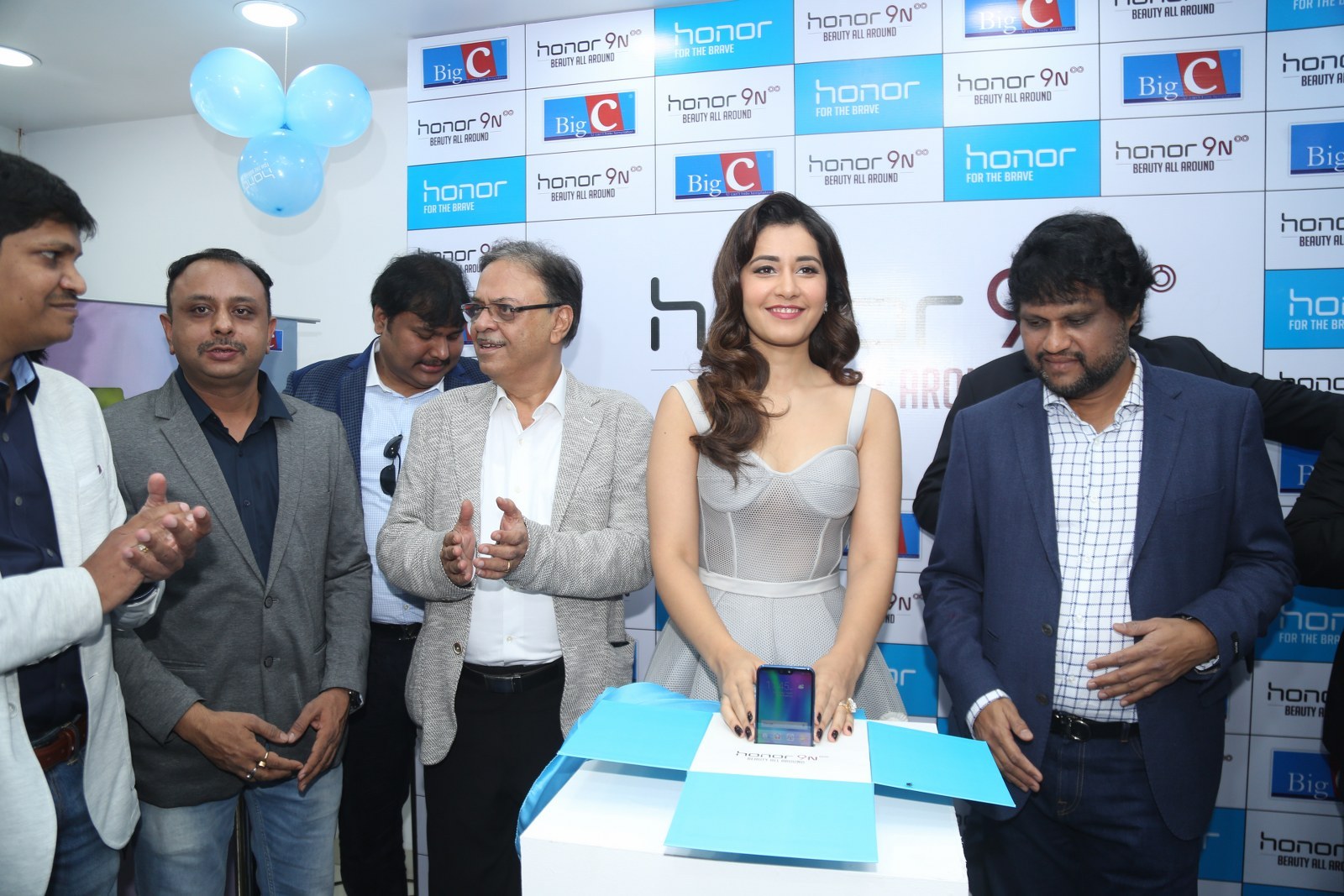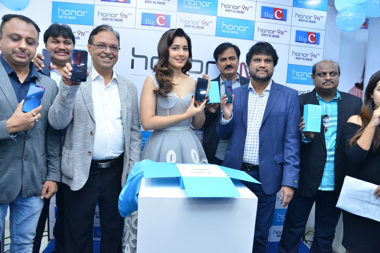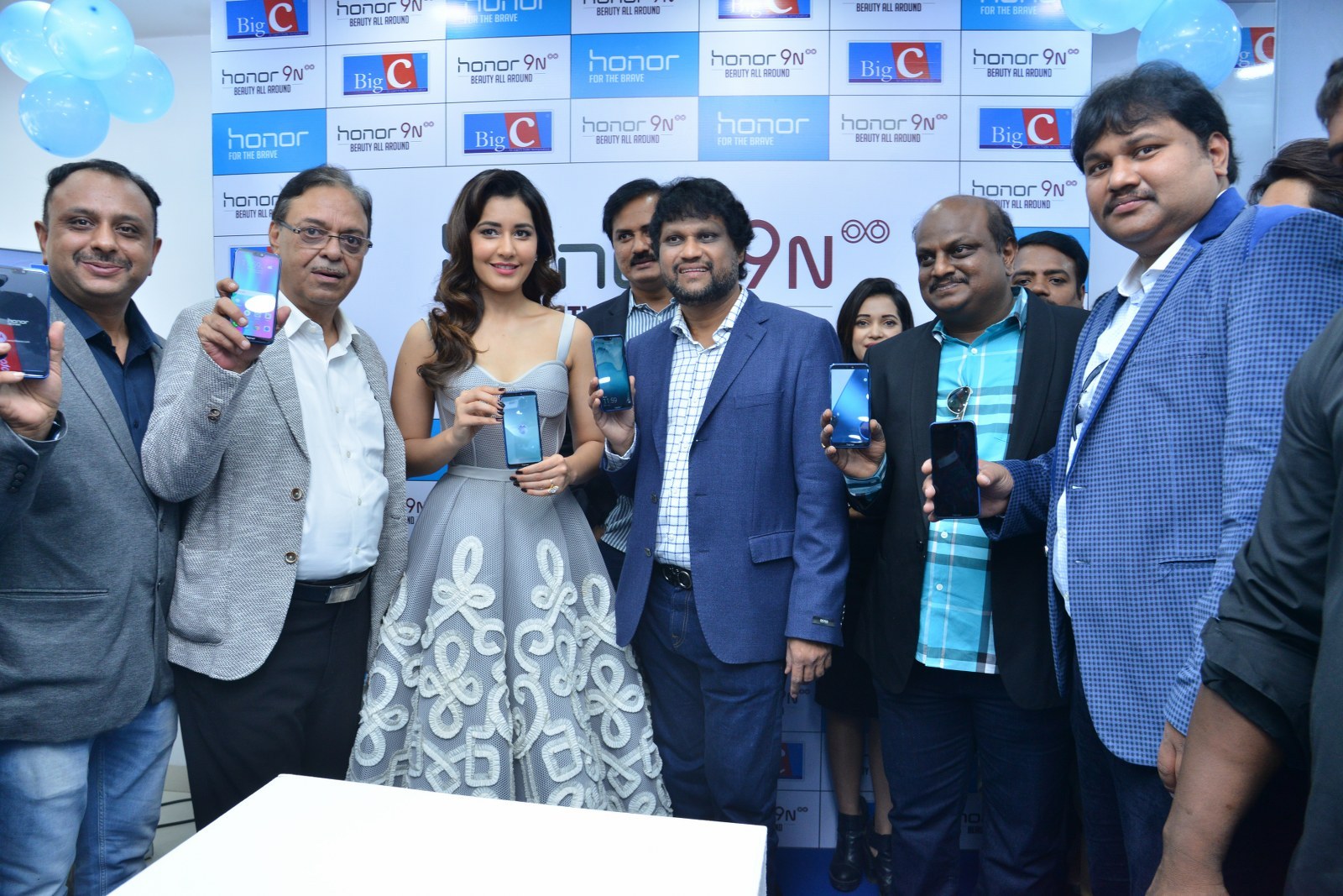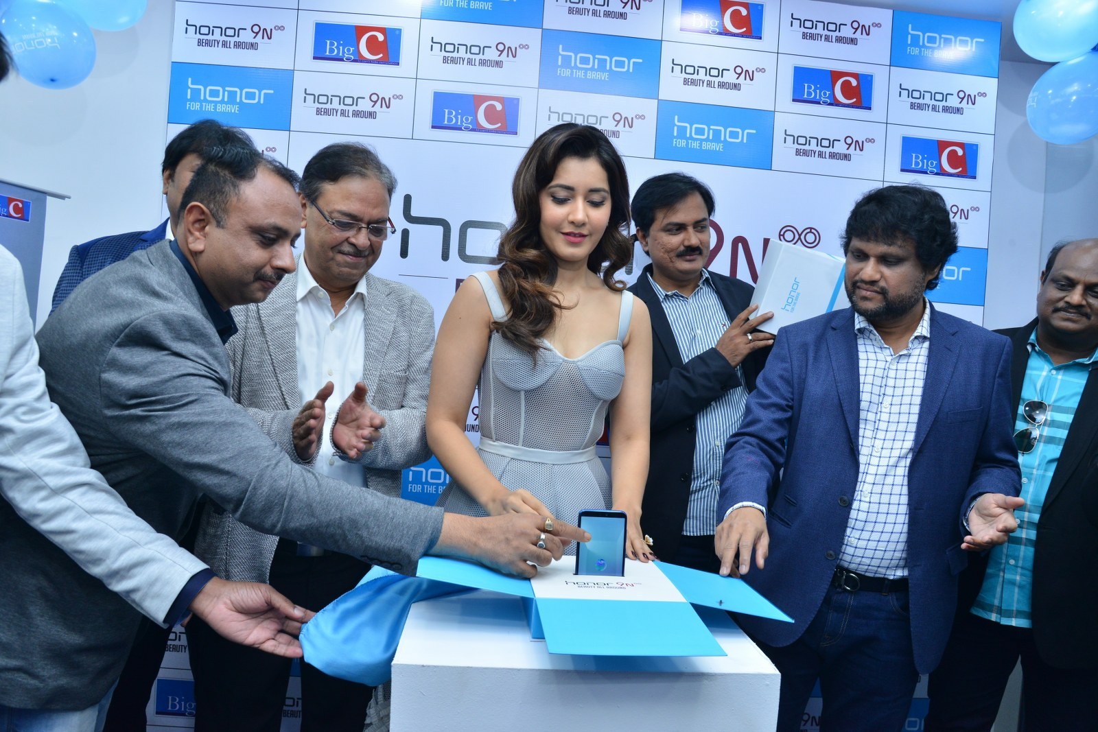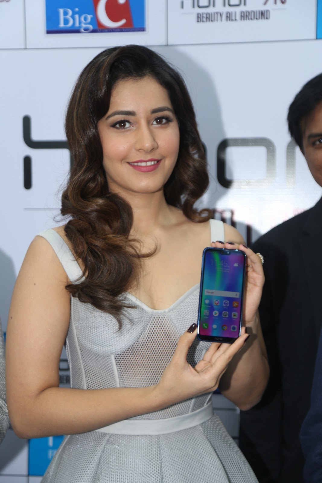 Raashi Khanna stills at Honor 9N launch at Big C store, Kukatpally, Hyderabad on 1st August, 2018 wearing a tulle corset dress by Alpana Neeraj. Jewelry from Jatin Mor, Prada heels and soft wavy hair rounded out her look!