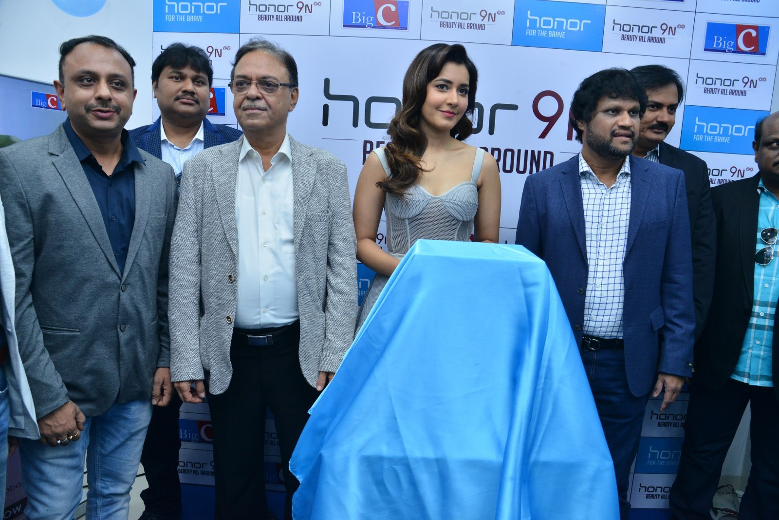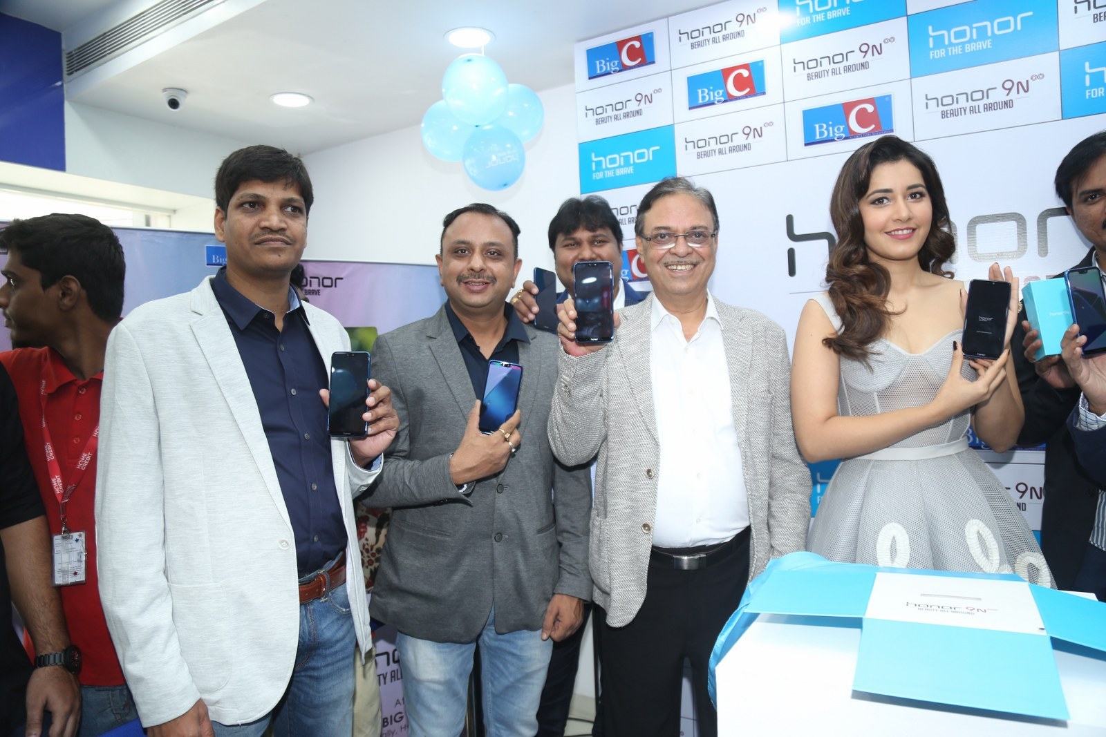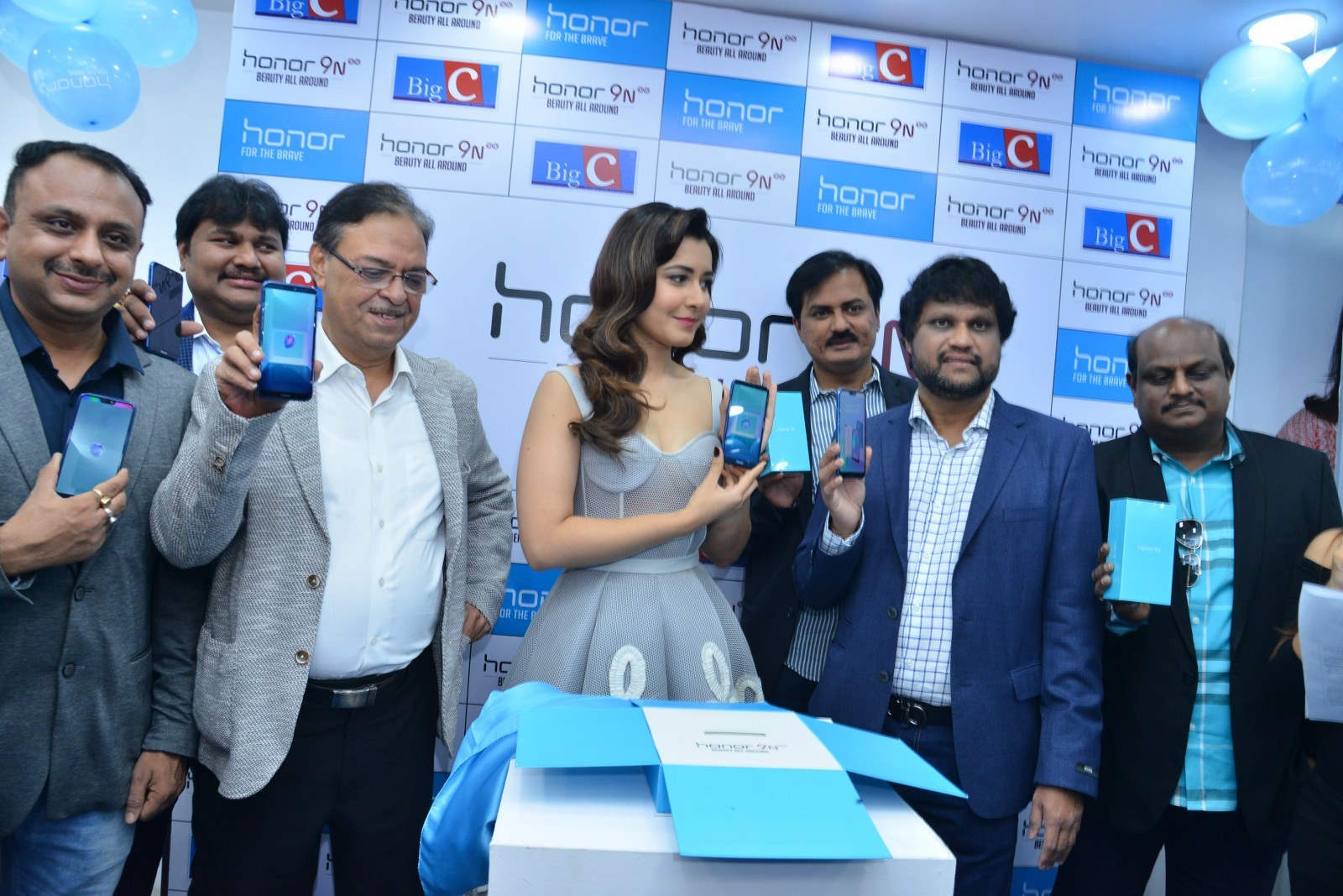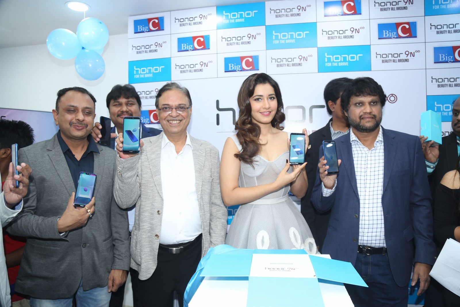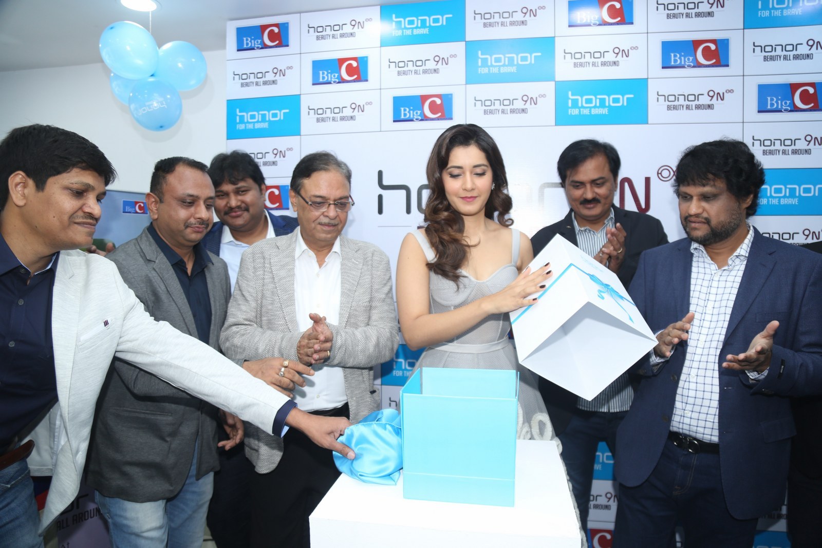 Raashi Khanna stills at Honor 9N launch at Big C store, Kukatpally, Hyderabad on 1st August, 2018 wearing a tulle corset dress by Alpana Neeraj. Jewelry from Jatin Mor, Prada heels and soft wavy hair rounded out her look!