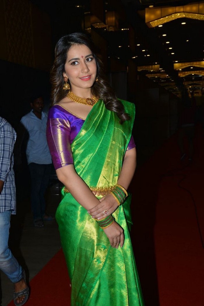 Raashi Khanna stills in saree at Srinivasa Kalyanam Audio Release. Raashi Khanna attended the audio launch event of her upcoming movie Srinivasa Kalyanam wearing a green kanchipuram silk saree paired with contrast purple elbow length sleeves blouse. Traditional gold jewellery and soft curls rounded out her look!