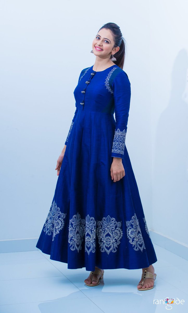 Rakul Preet Singh glam stills in blue crepe embroidered Maxi Dress at Telugu movie Bharateeyudu 2 (Indian 2) press meet.