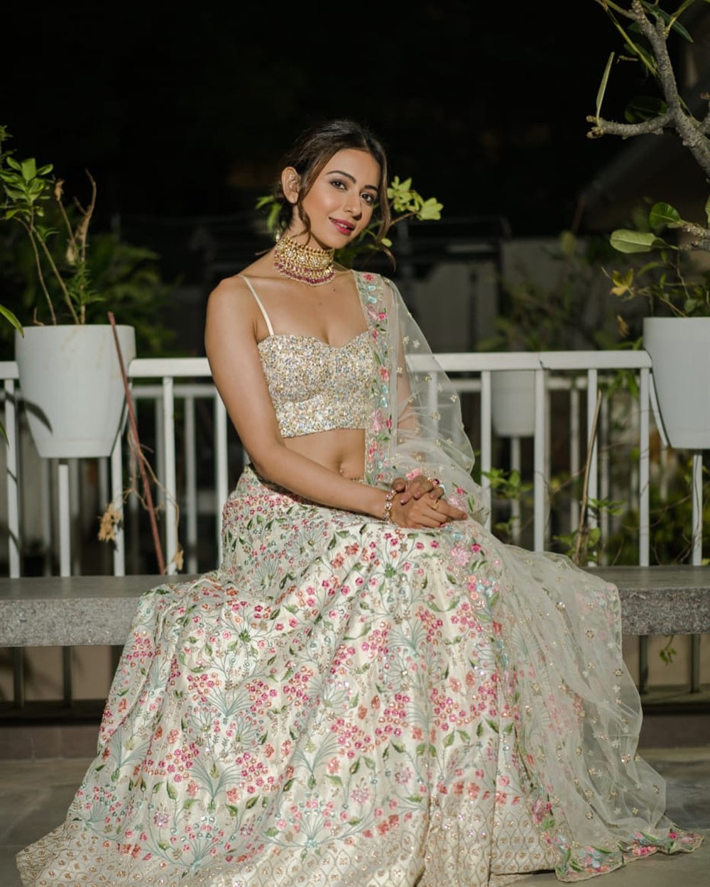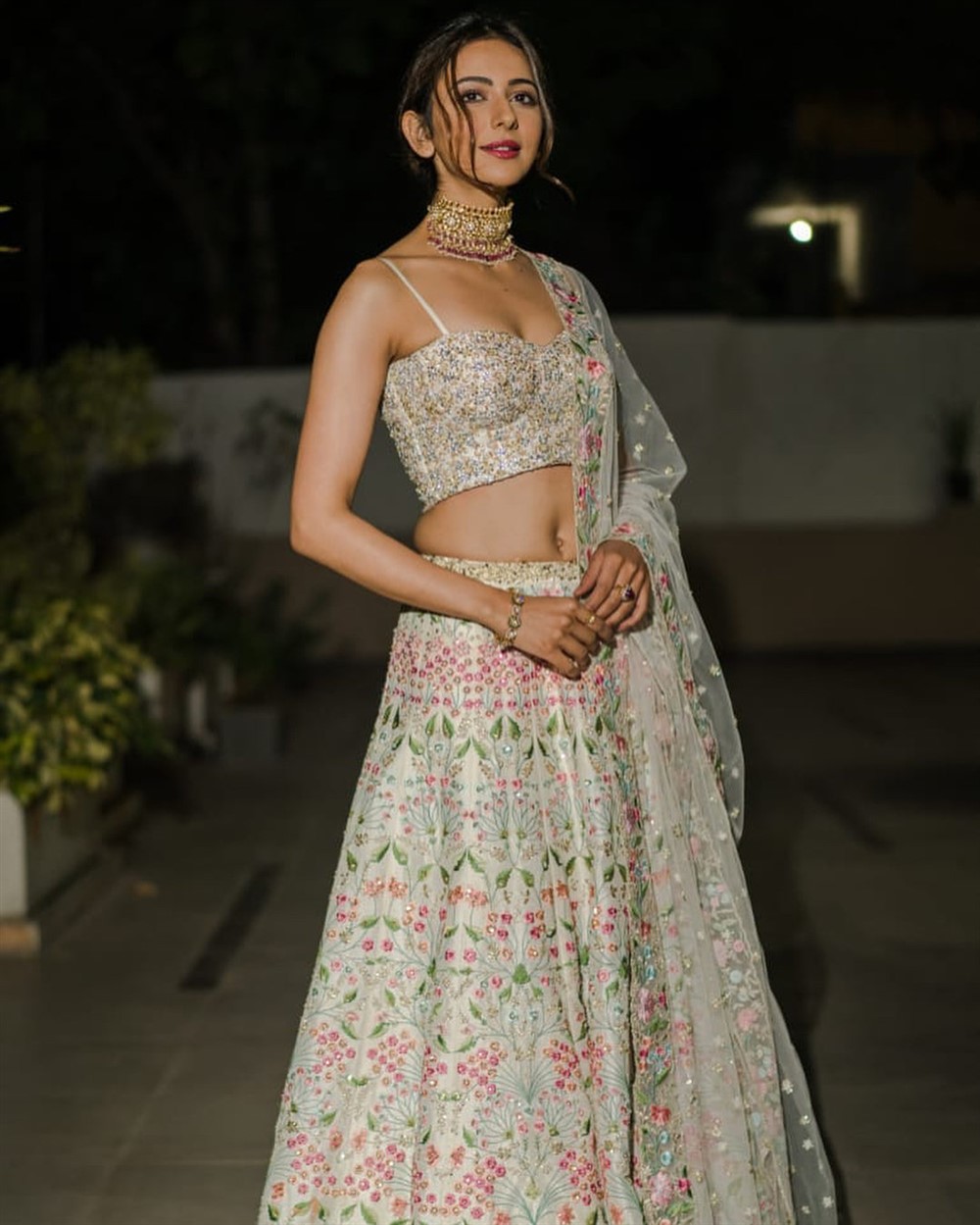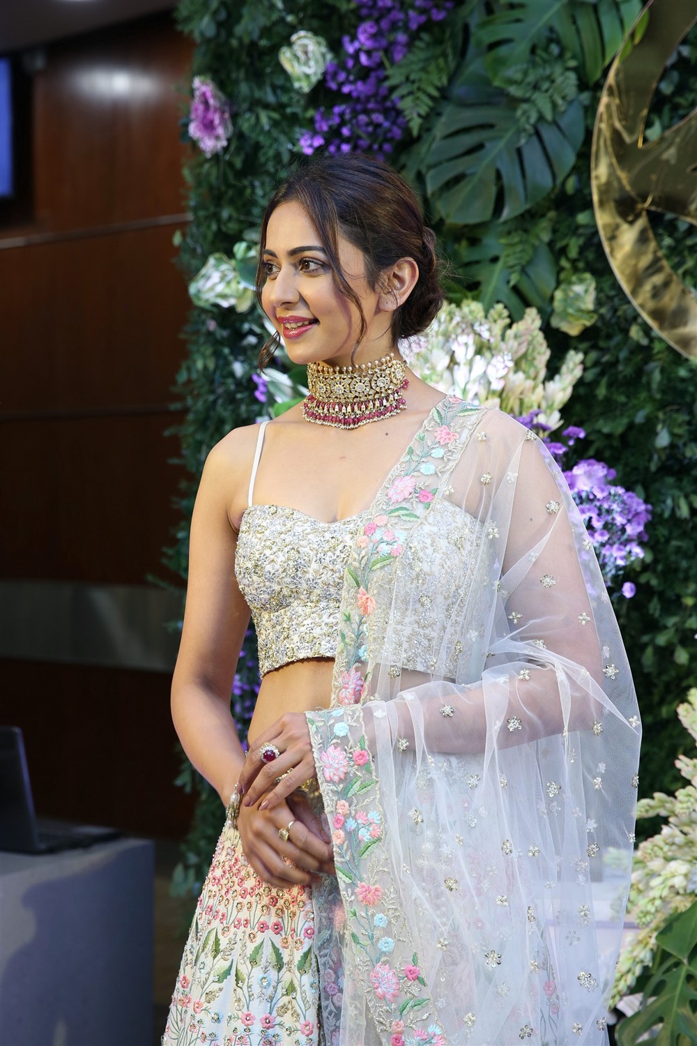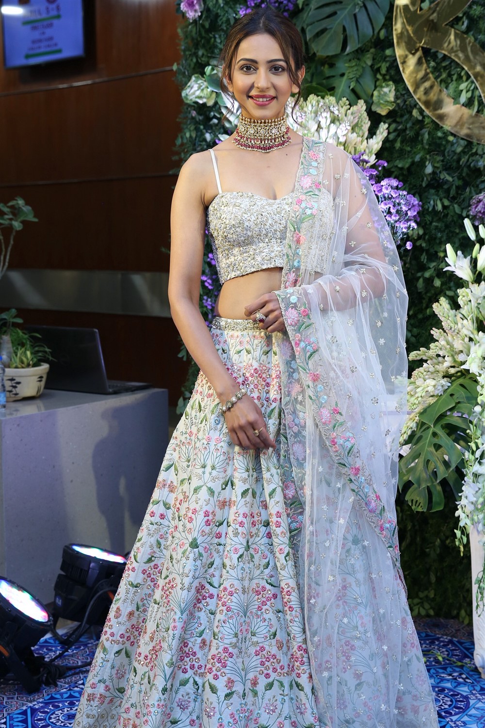 Rakul Preet Singh photos at Saina Nehwal Wedding Reception. Rakul Preet Singh attended Saina Nehwal and Parupalli Kashyap’s wedding reception wearing a white embroidered lehenga by Chamee and Palak. Statement uncut choker from Jatin Mor Jewellers and an updo rounded out her look!