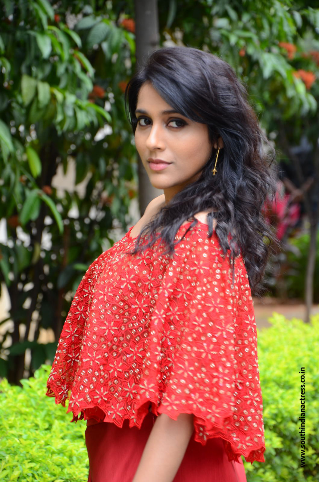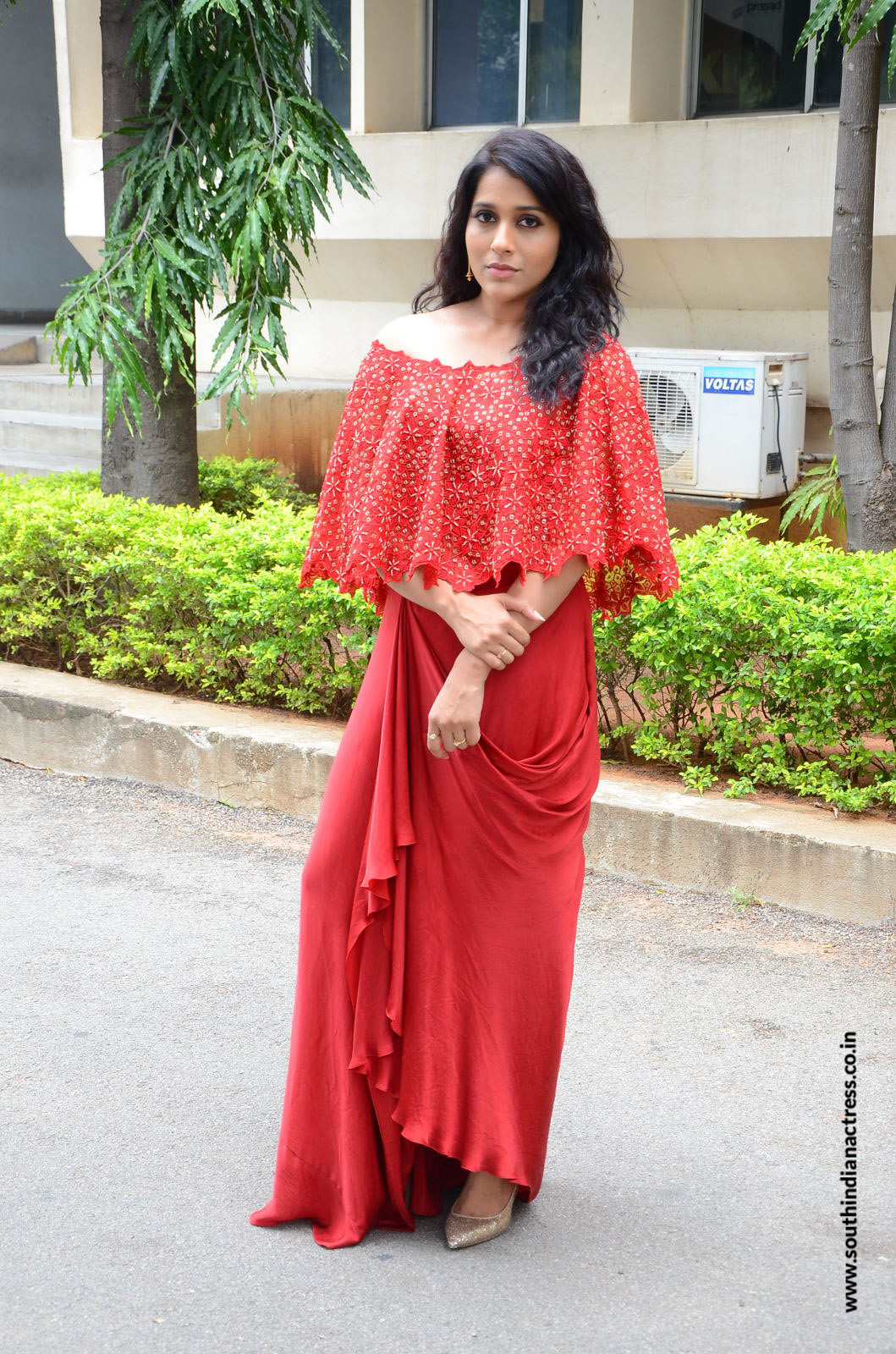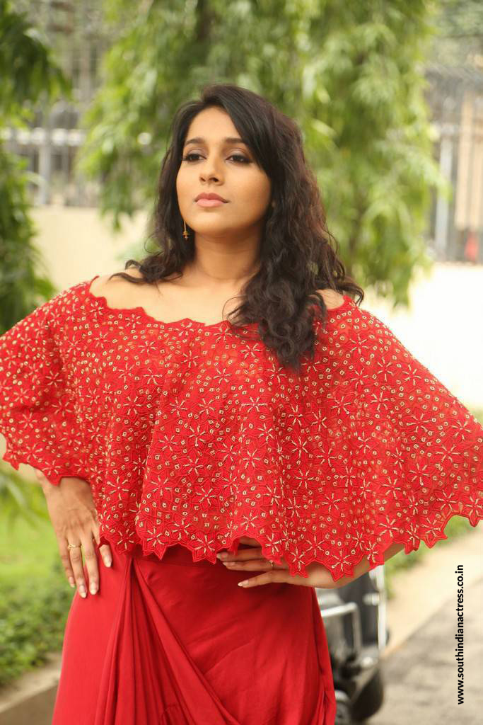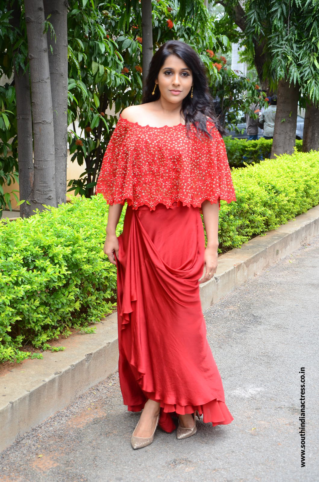 Rashmi Gautam attended the trailer launch event of her upcoming movie Next Nuvve wearing wearing a red embroidered off-shoulder cape top paired with matching red draped skirt by Sashi Vangapally. Gold pumps and wavy hair finished out her look! Here is Rashmi Gautam at her next Telugu movie Next Nuvve Trailer Launch