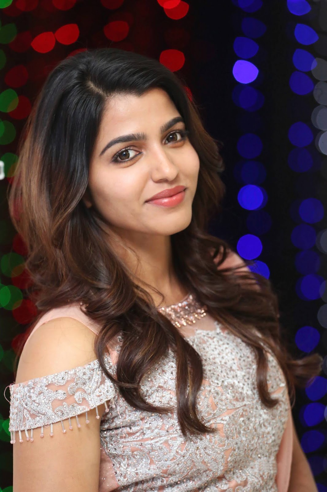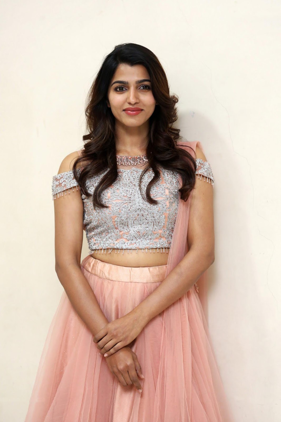 Sai Dhanshika stills at Sri Sai Lakshmi Creations Movie Launch. Sai Dhanshika wearing baby blue color lehenga styled by Geethika Kanumilli