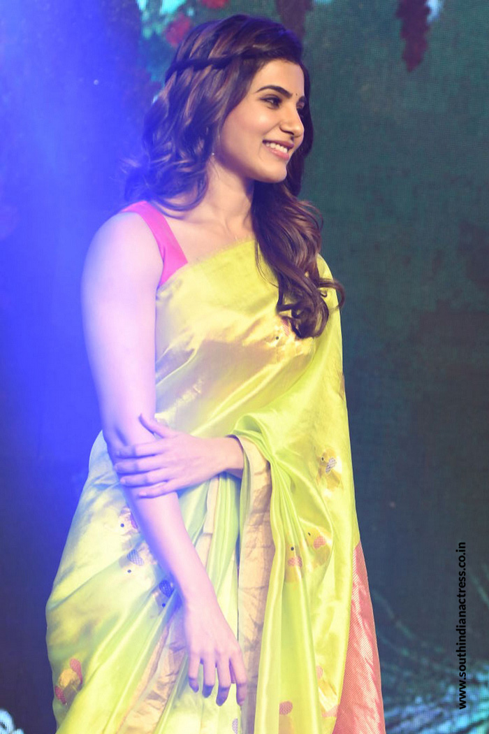 Samantha Akkineni attended the audio launch event of Balakrishnudu movie wearing a green elephant motifs handloom saree paired with contrast pink sleeveless blouse from Madhurya Creations. A pair of white stone jhumkis and waterfall hairstyle completed her look!