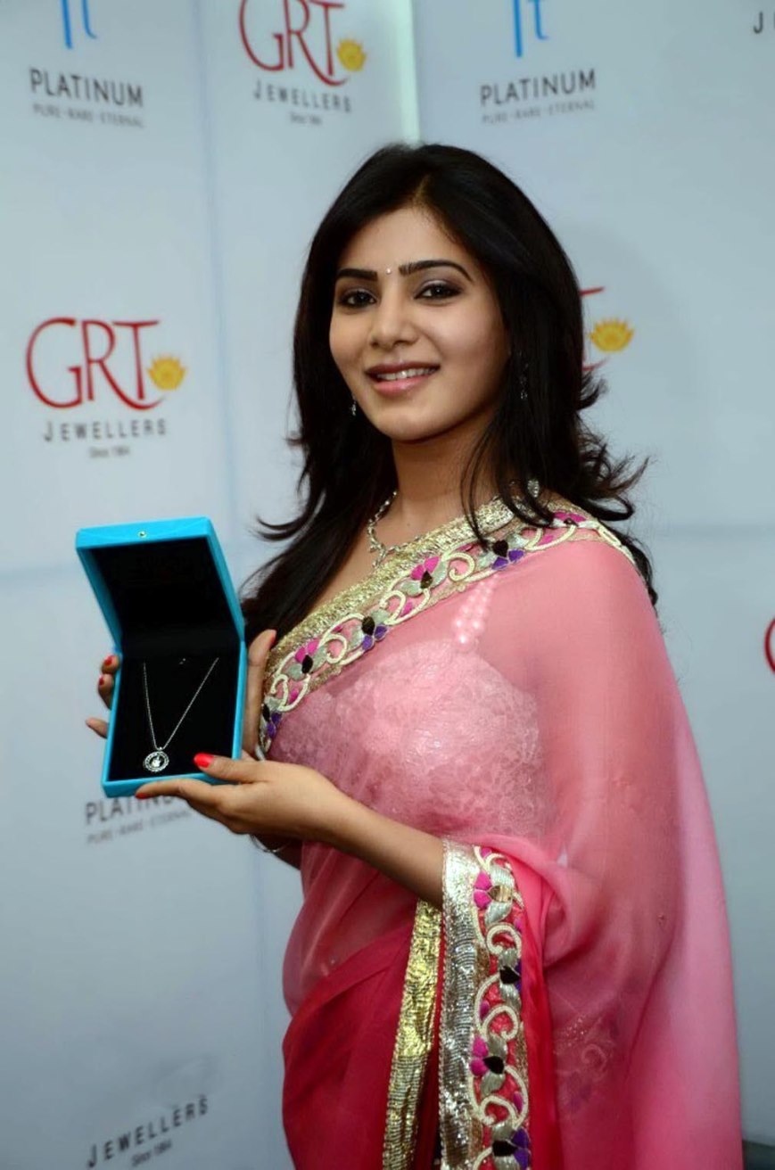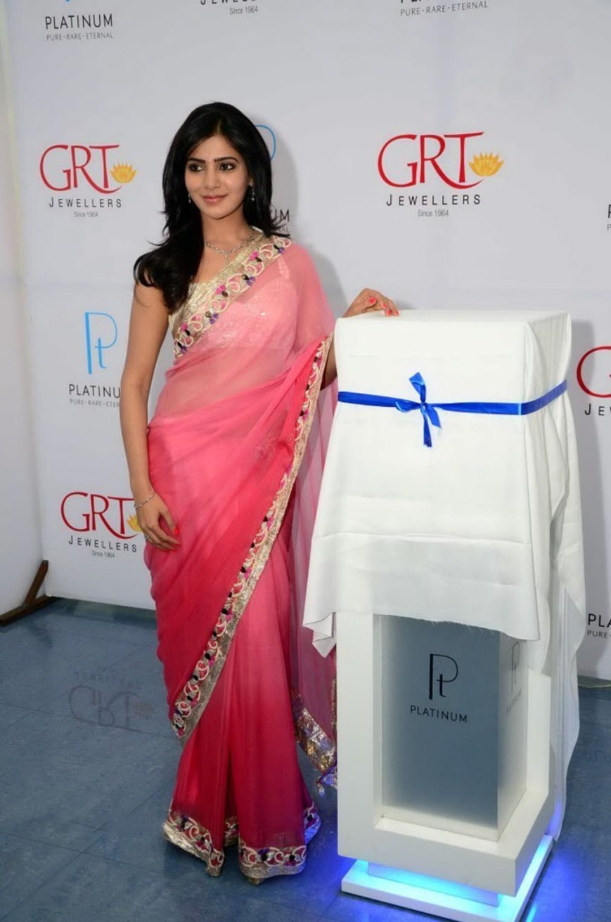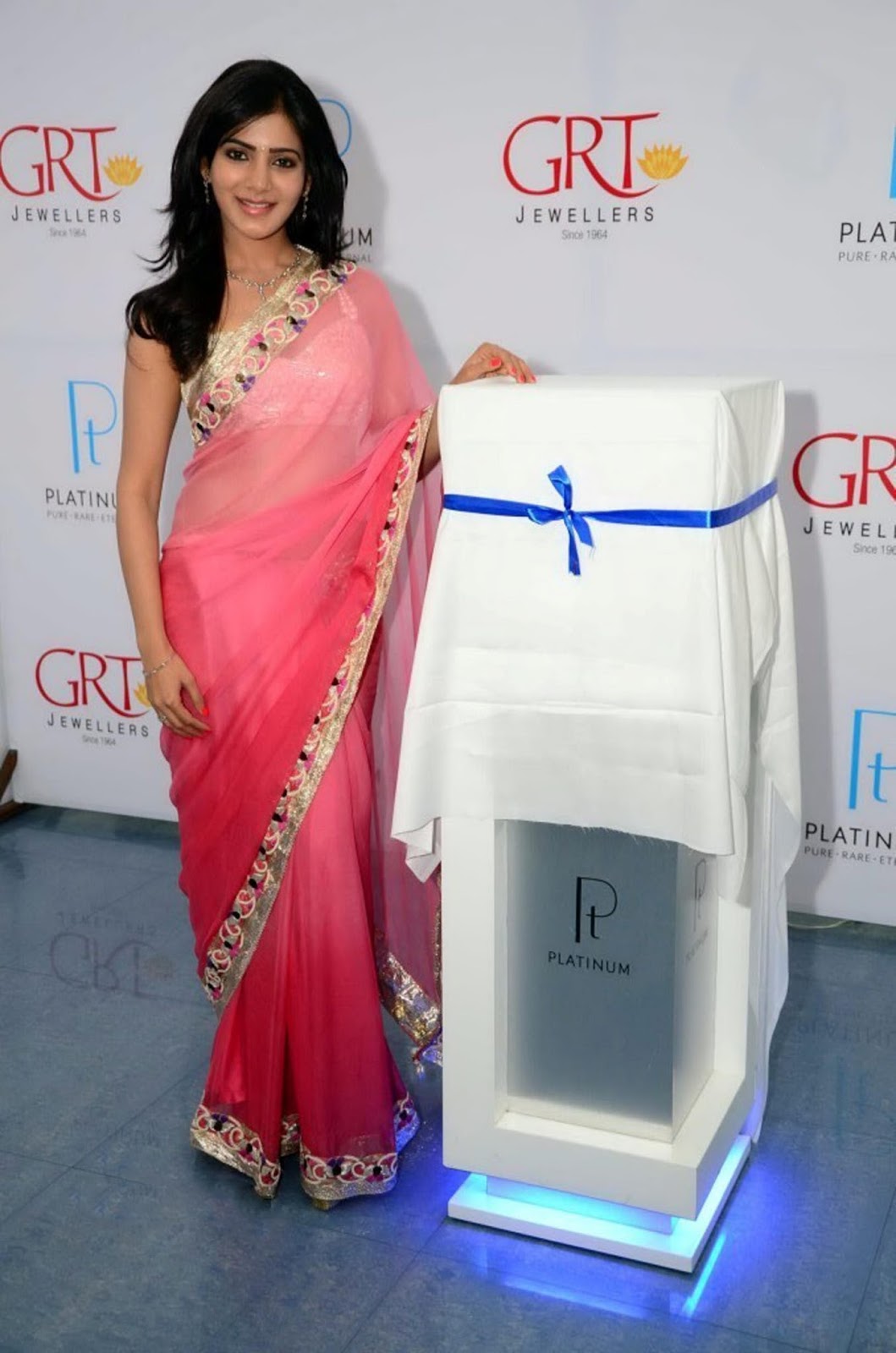 Samantha Akkineni pink saree stills at GRT Jewellery opening.