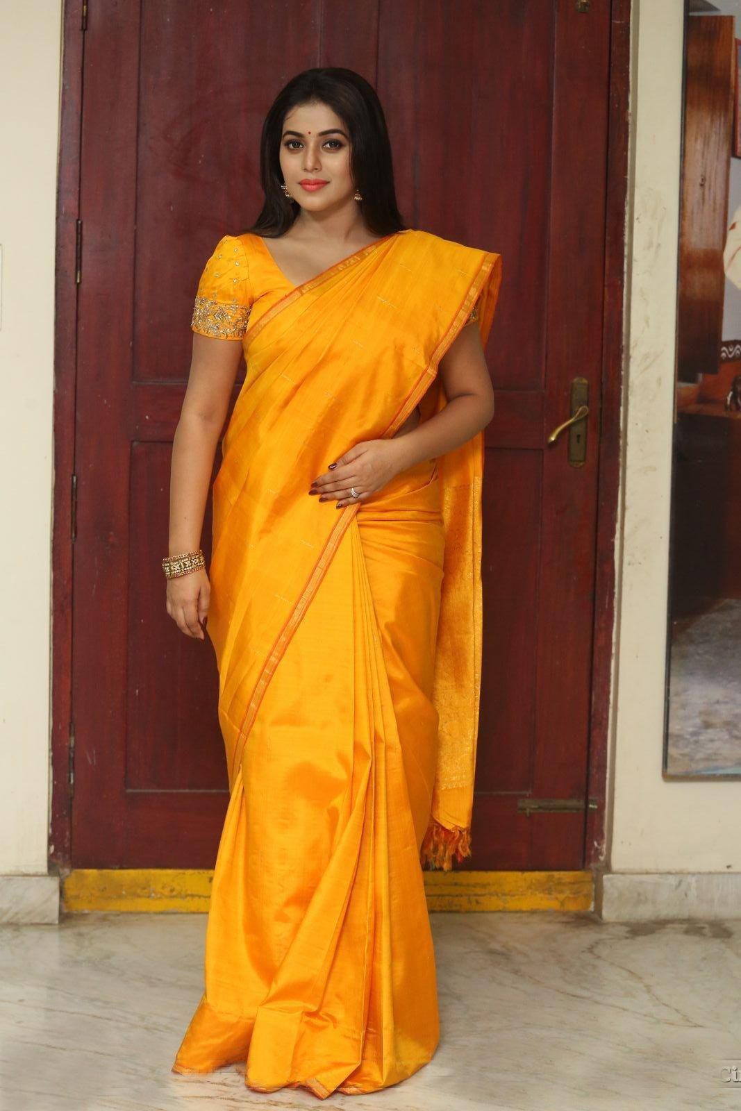 Poorna (Shamna Kasim) wore a bright yellow solid silk saree for the movie opening of ‘Avanthika’. Considering the saree itself is very bright