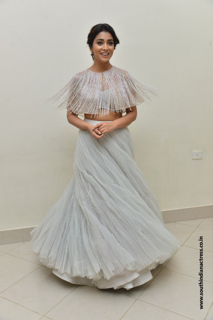 Shriya Saran attended Mohan Babu’s felicitation event and Gayatri movie Music launch wearing a long skirt and cape top by Shriya Som. She kept the rest of her look minimal!