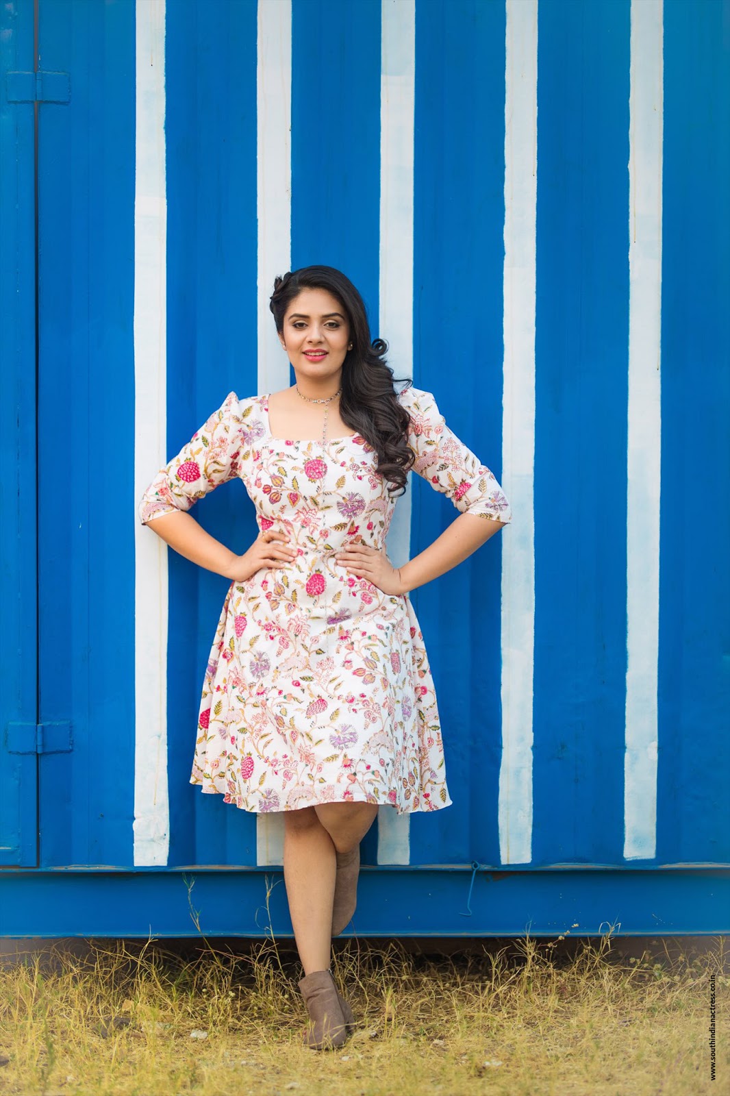 SreeMukhi stills in Green and White printed woven two-piece dress with off-shoulder neck, short sleeves, and flared hem from Berrylush. Photographed by Lakkshmi Kanth.