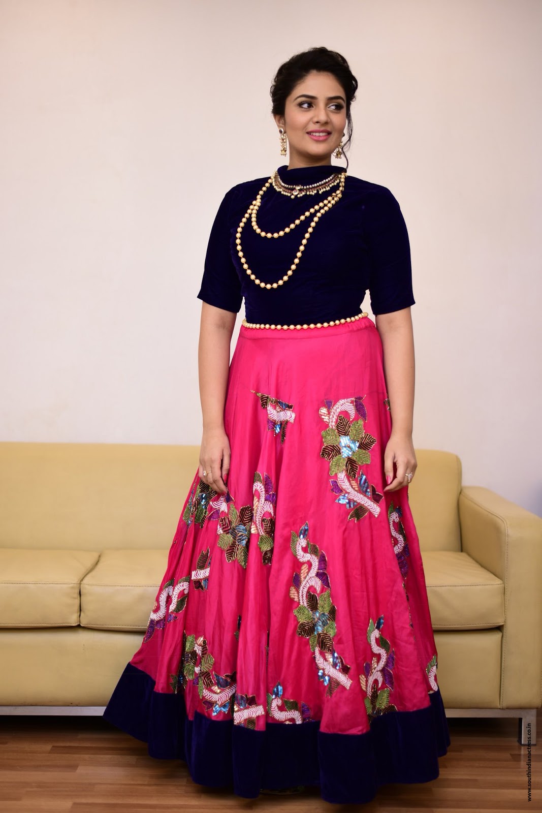 SreeMukhi stills from Saregamapa TV show wearing outfit by Rekha’s House of Coutures, Kirthana Sunil