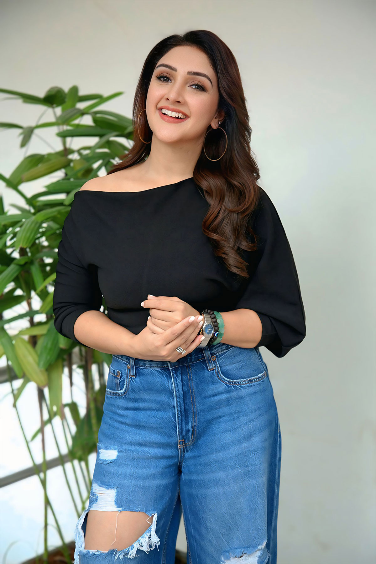 The beautiful Sridevi Vijaykumar looks stunning in a black top and ripped jeans combo during her interview for the Telugu movie Sundarakanda.