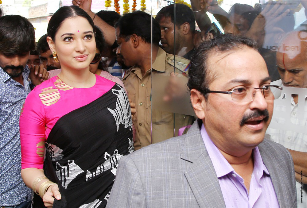 Telugu Actress Tamannaah Bhatia stills in saree for the Launch of B New Mobile Store at Proddatur, Kadapa Dist, AP. Tamannaah Bhatia wore a black crepe crushed saree that featured black and silver foil Fish print with contrast pink high neck backless blouse from House Of Masaba. She accessorized her saree with gold earrings and bangles from Azotiique. A center parted sleek bun adorned with pink flowers and dewy makeup rounded off her look!