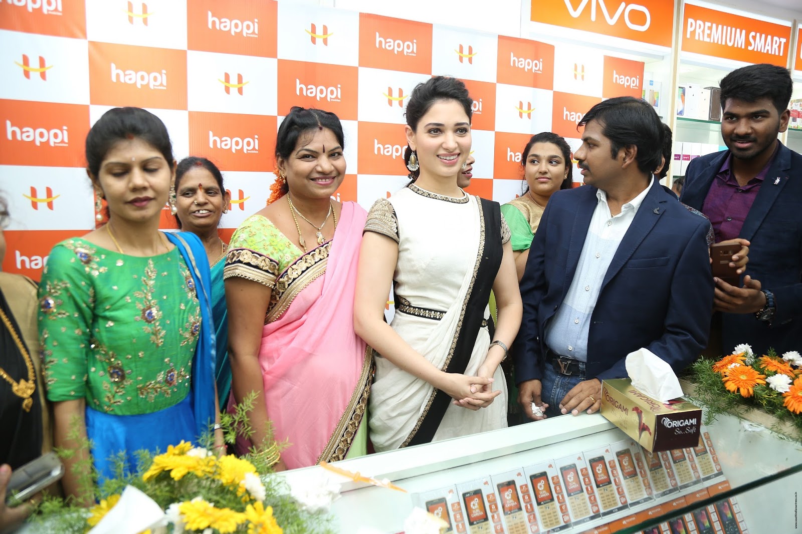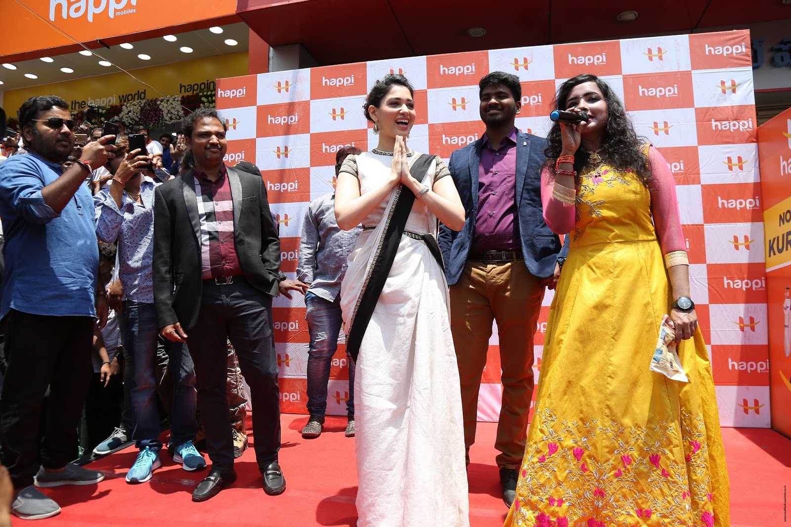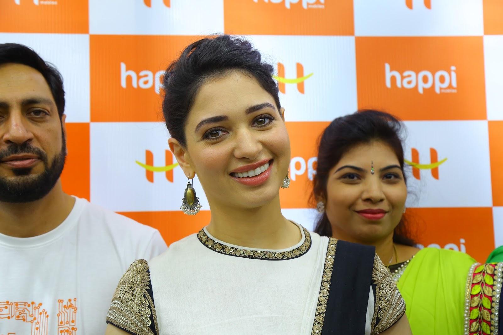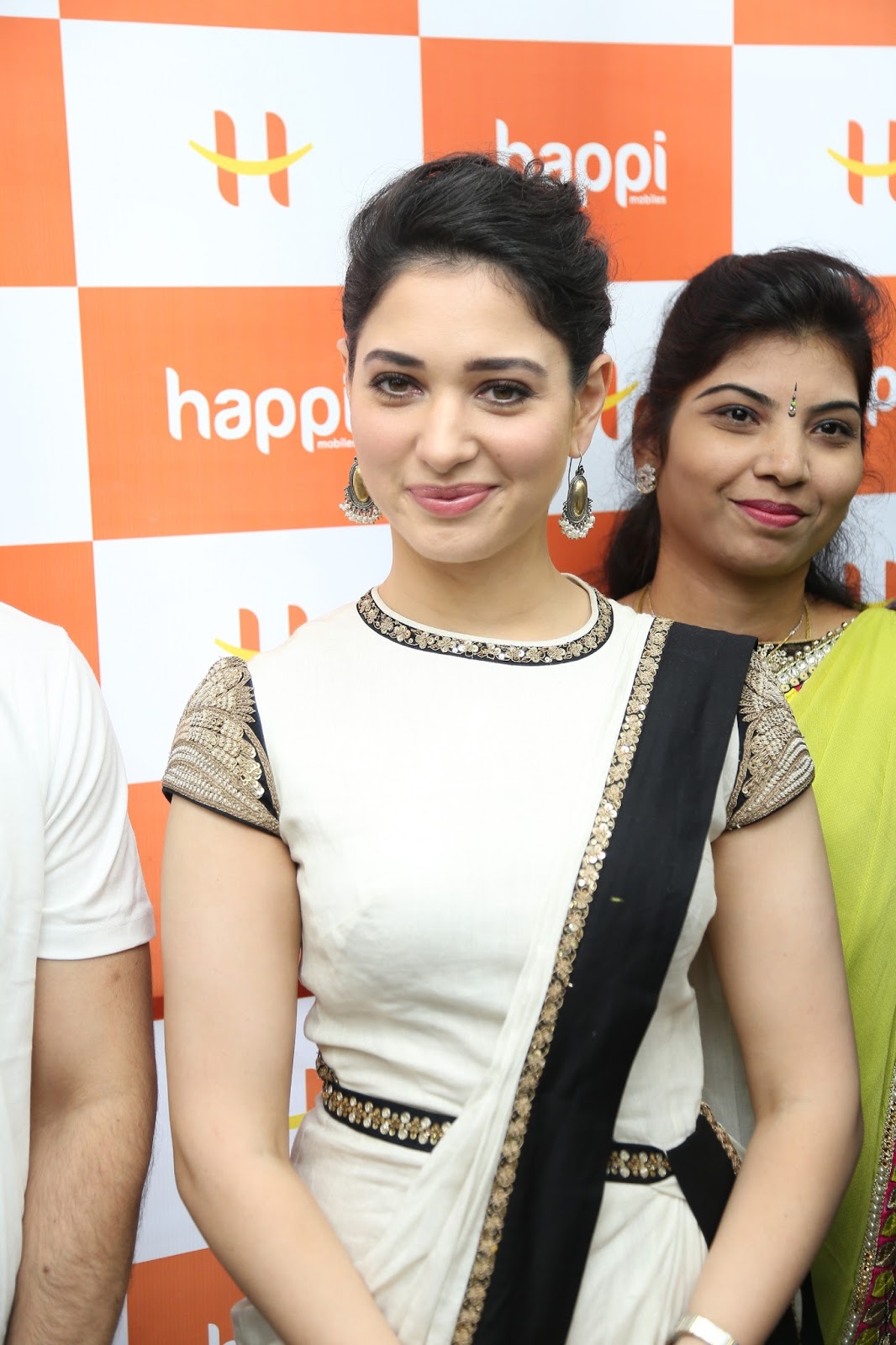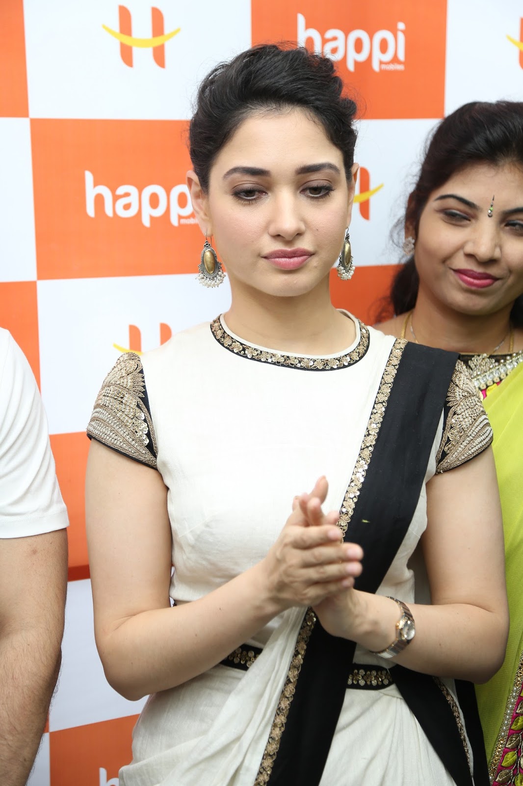 Tamannaah Bhatia launches Happi Mobiles store in Kurnool, Andhra Pradesh. For the event Tamannaah was seen in a Tarun Tahiliani white saree with black patch border, paired with a matching blouse.