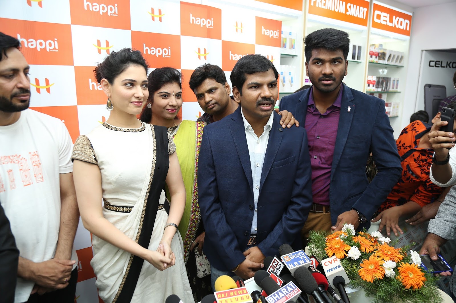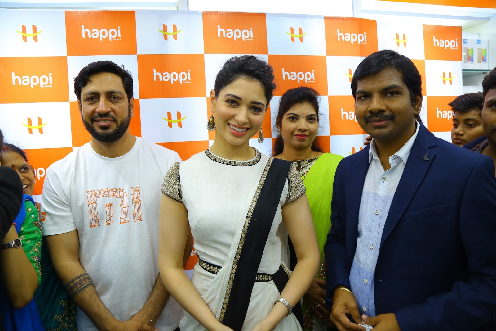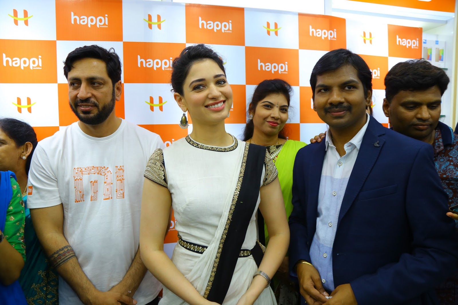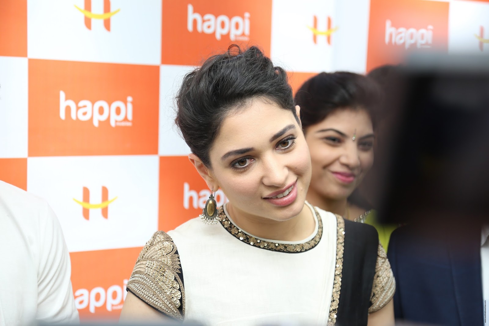 Tamannaah Bhatia launches Happi Mobiles store in Kurnool, Andhra Pradesh. For the event Tamannaah was seen in a Tarun Tahiliani white saree with black patch border, paired with a matching blouse.