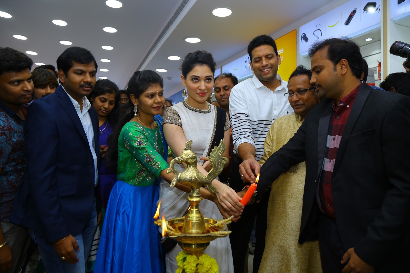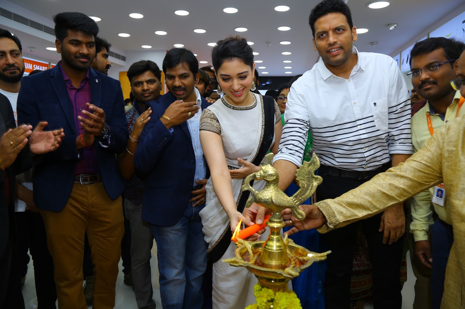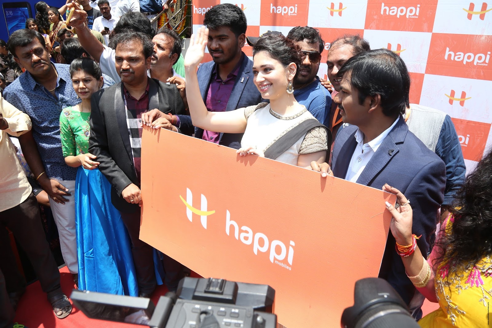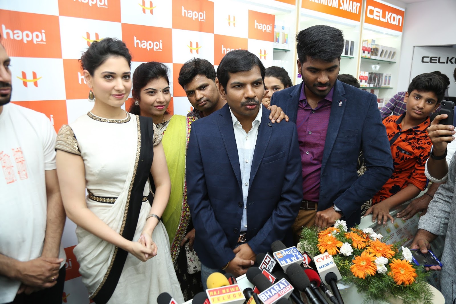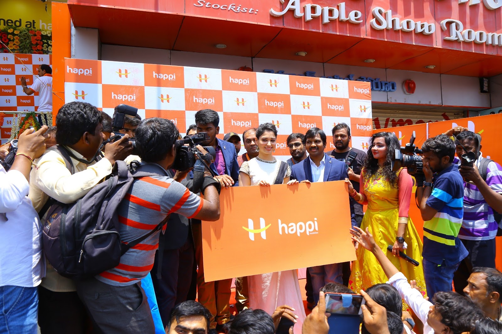 Tamannaah Bhatia launches Happi Mobiles store in Kurnool, Andhra Pradesh. For the event Tamannaah was seen in a Tarun Tahiliani white saree with black patch border, paired with a matching blouse.